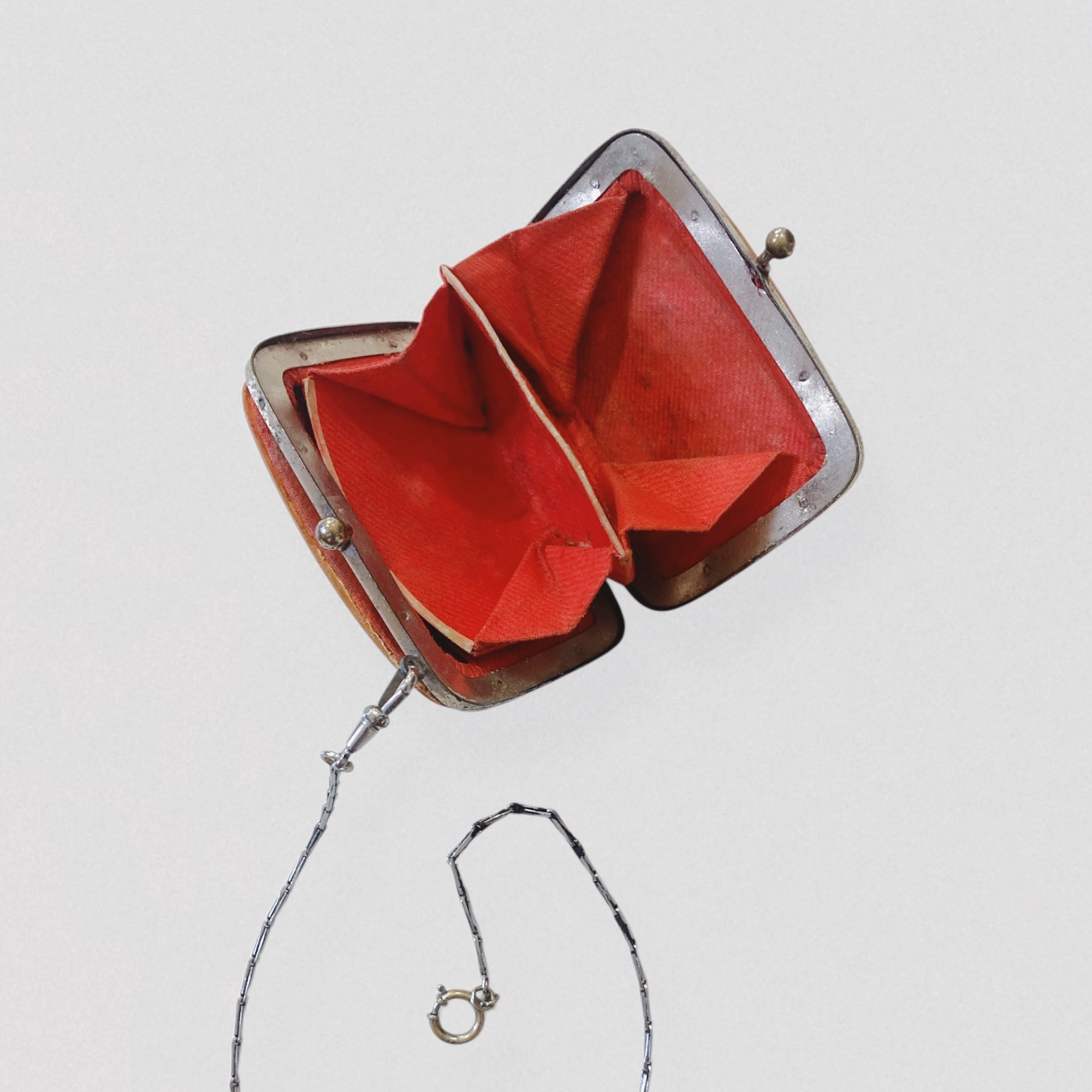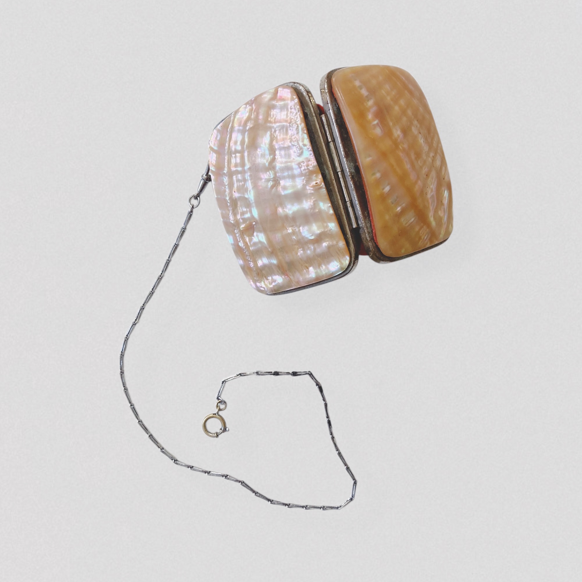 Vintage antique XIXe century mother-of-pearl coin purse with chain century mother-of-pearl coin purse with chain. This rigid rectangular purse features two stunning textured mother-of-pearl panels in iridescent pink tones, mounted on a brass frame. Inside, a red fabric accordion compartment system creates three small separate storage sections. The purse also has a small chain with a clasp at each end (the chain is not original to the piece), allowing it to be worn around the wrist as a micro handbag or attached to a bag as a charm. A rare piece!