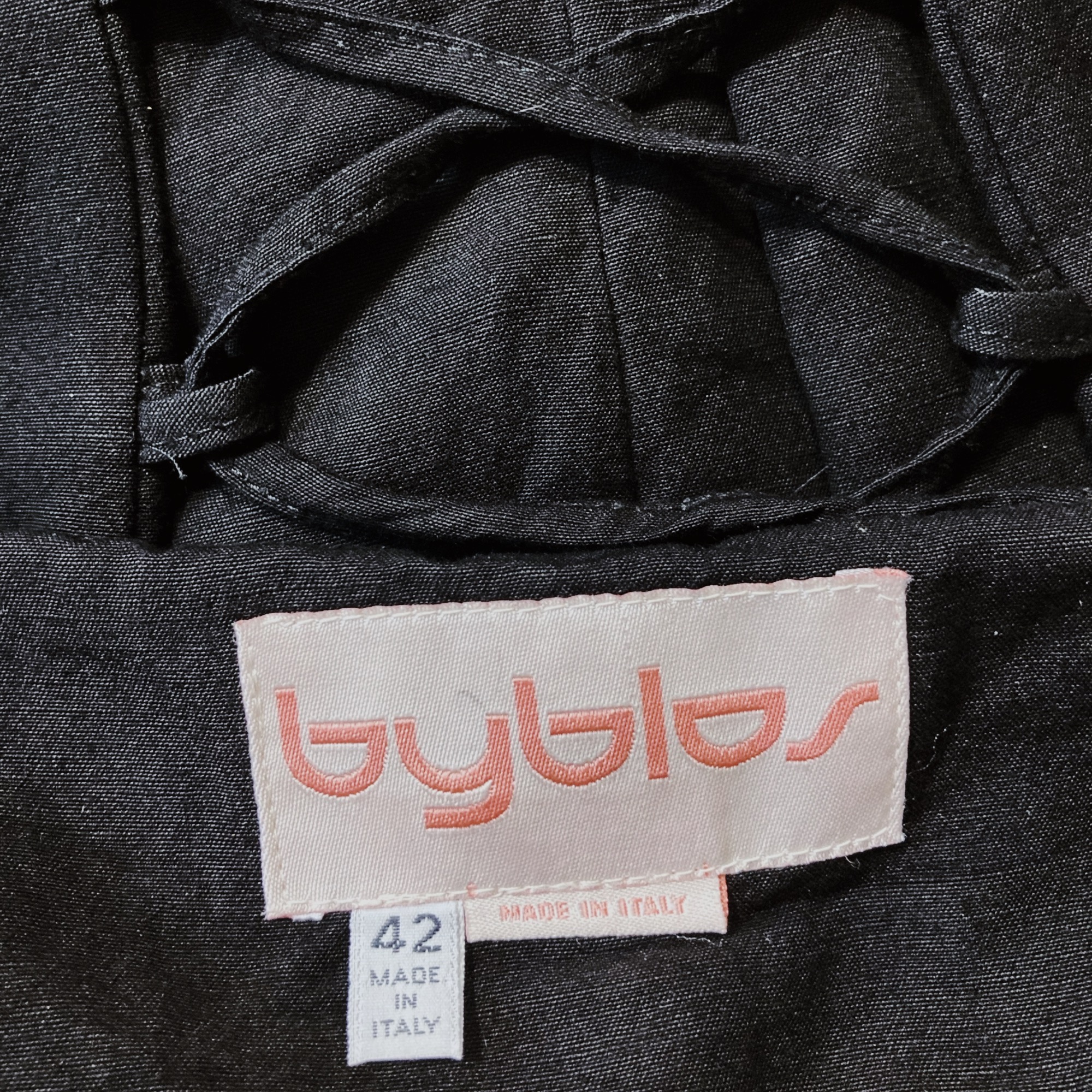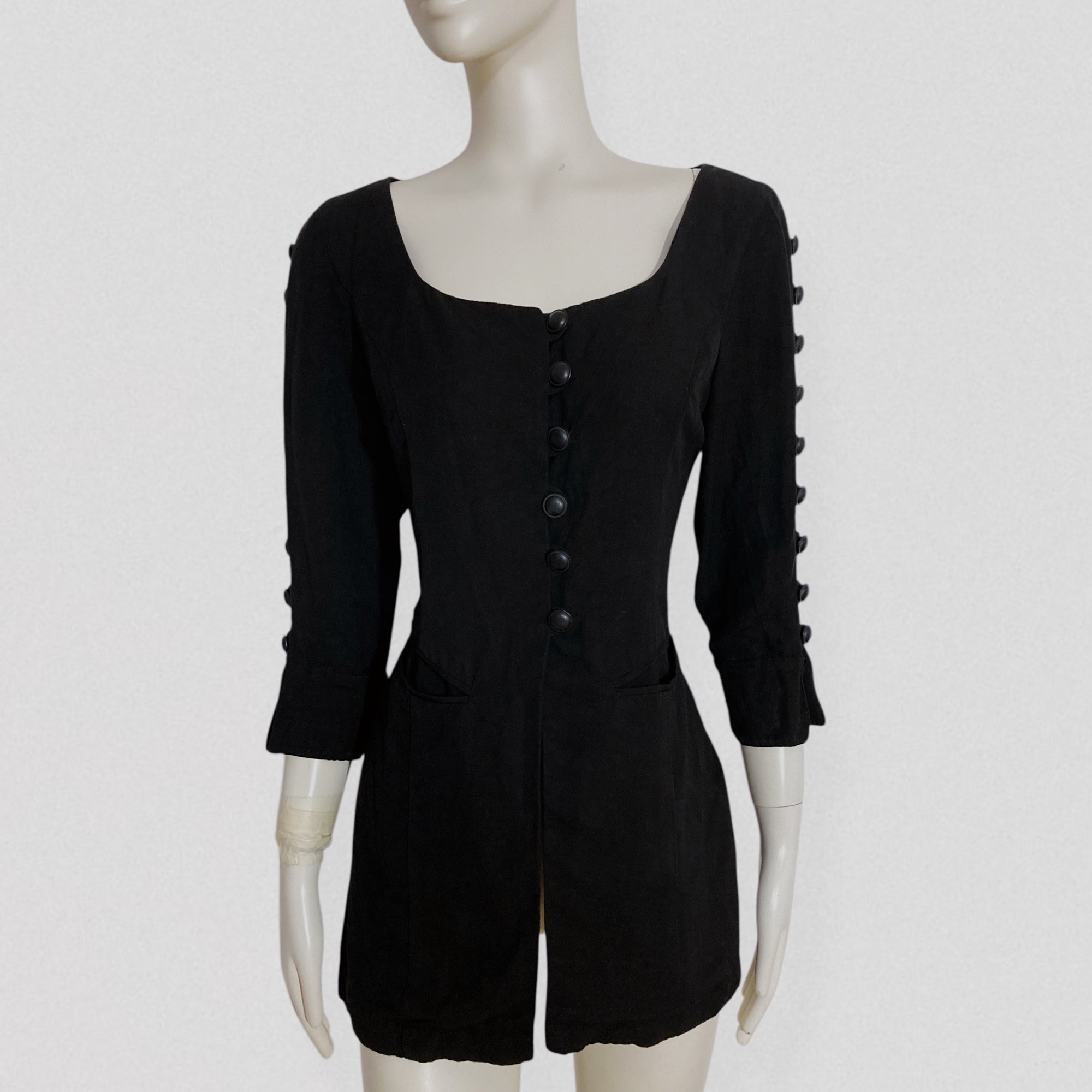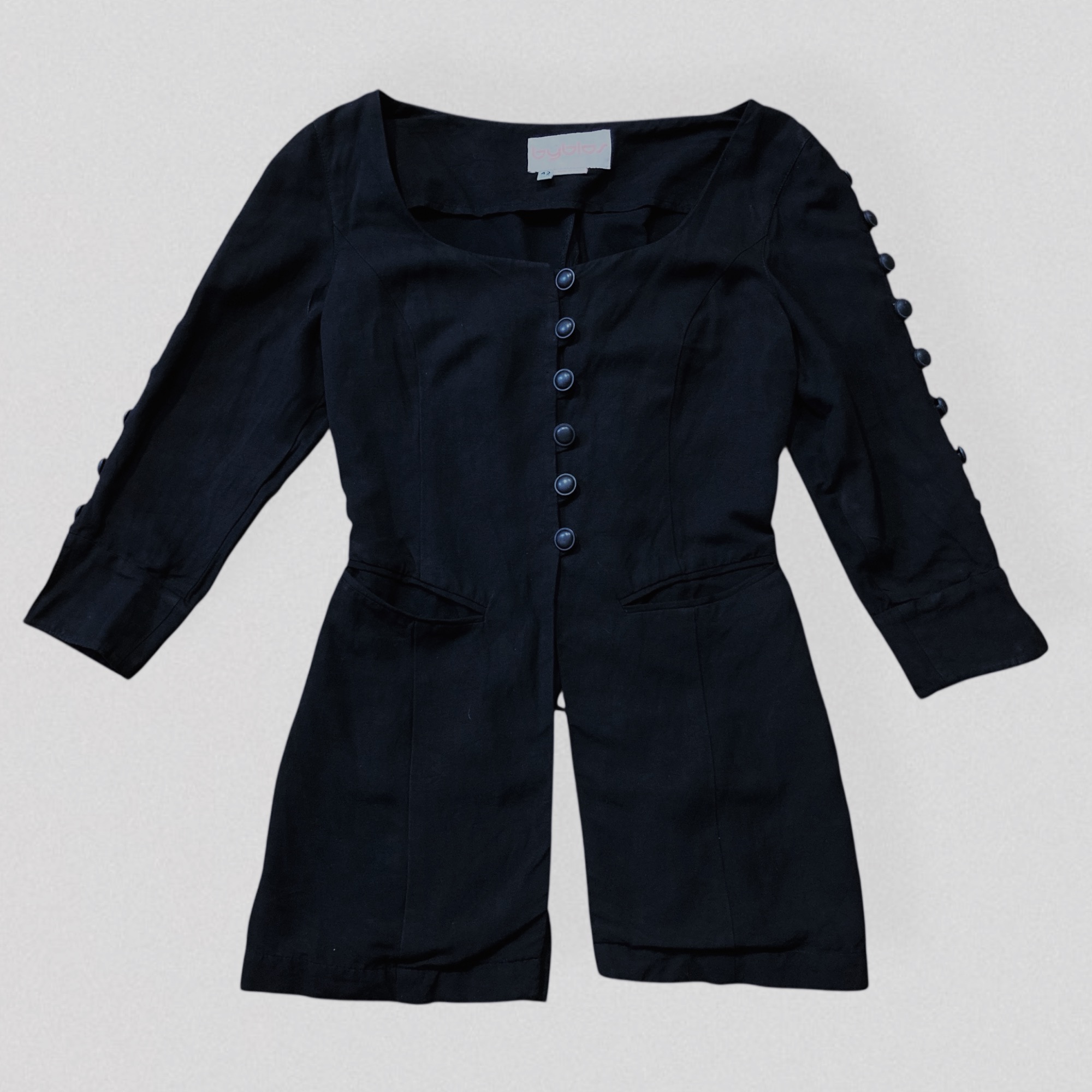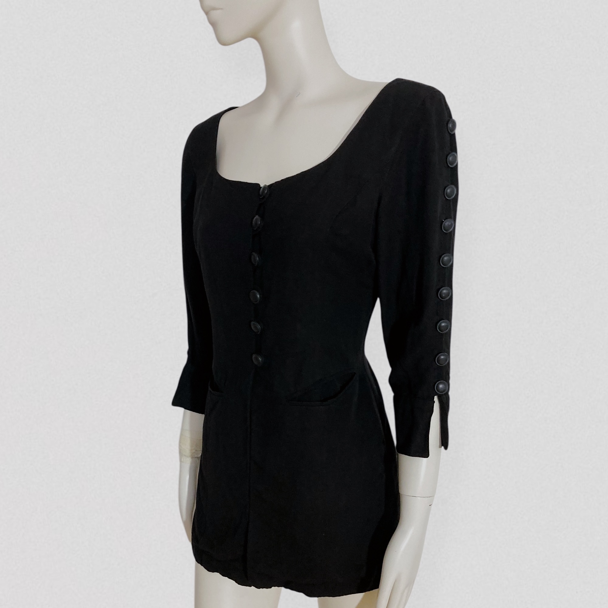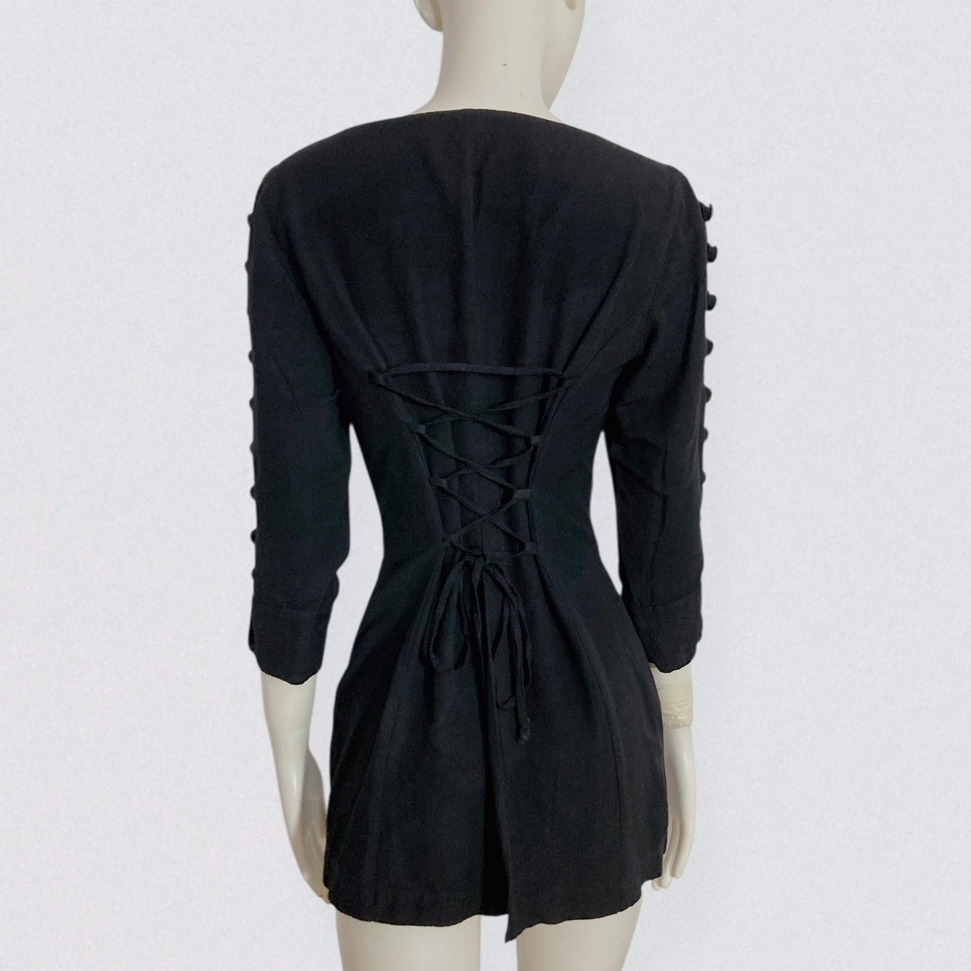 Vintage 80s longline black top by Italian brand Byblos, crafted from a soft and structured linen-viscose blend. The design features a slightly fitted waist, ¾ sleeves with decorative buttons, a square neckline, and two front pockets. It closes at the bust with front buttons like a jacket. The back is slit at the hem and enhanced with corset-style lacing, allowing you to adjust the fit. Fully lined.