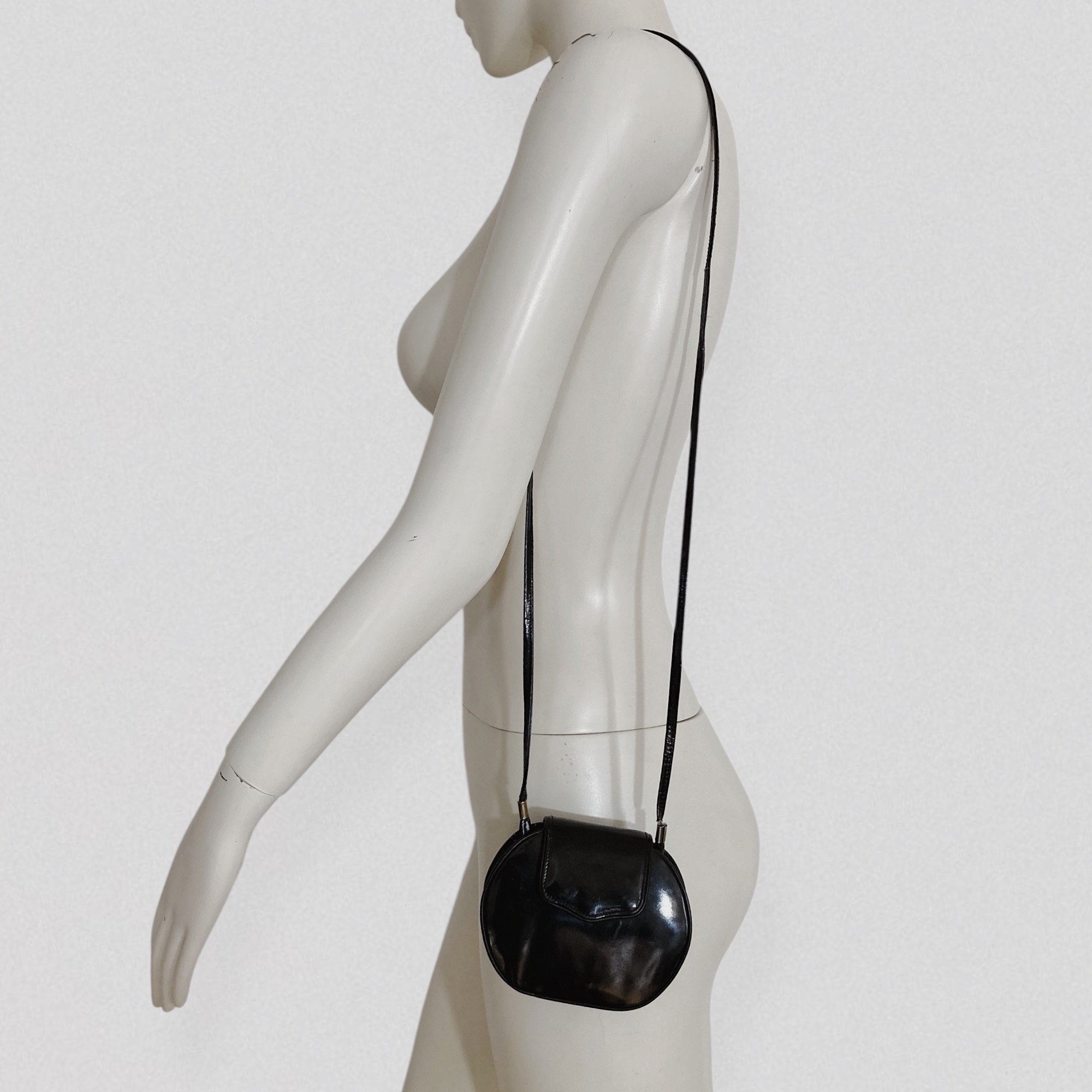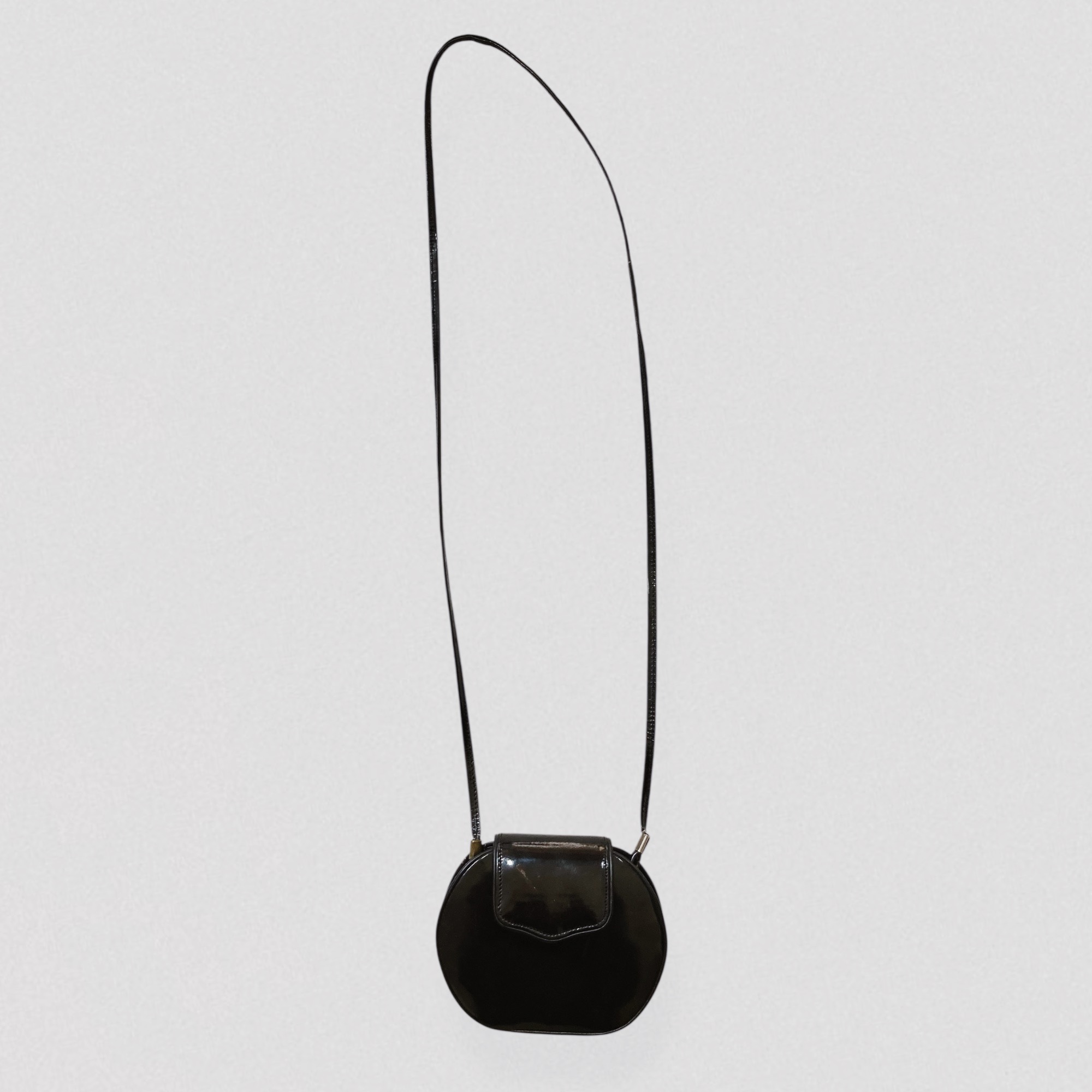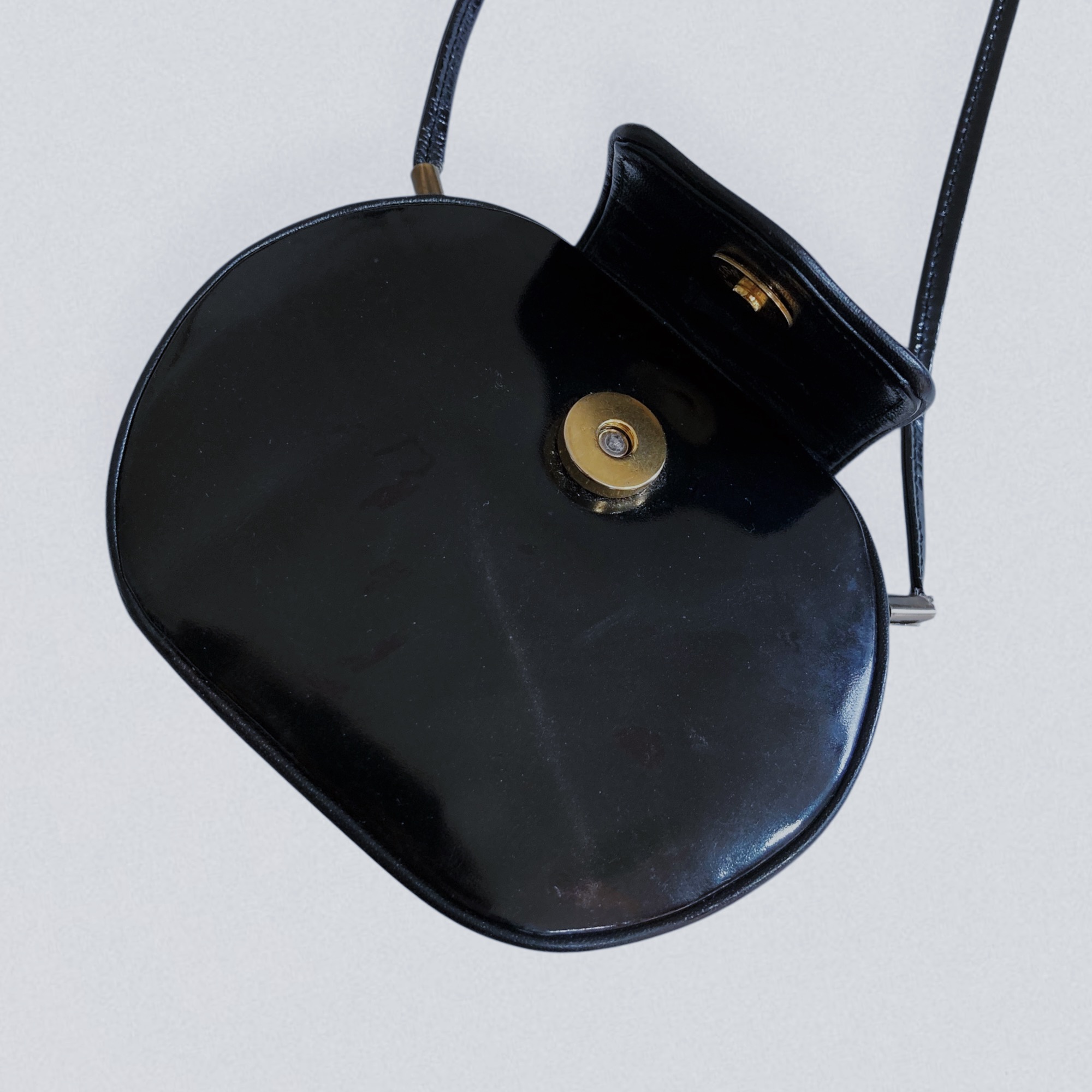 Vintage 1970s oval-shaped mini bag in black vinyl leather by Brazilian brand Eberle. This adorable mini bag features a sleek oval silhouette and a long thin strap, allowing it to be worn on the shoulder or crossbody. It closes with a flap secured by a magnetic button.