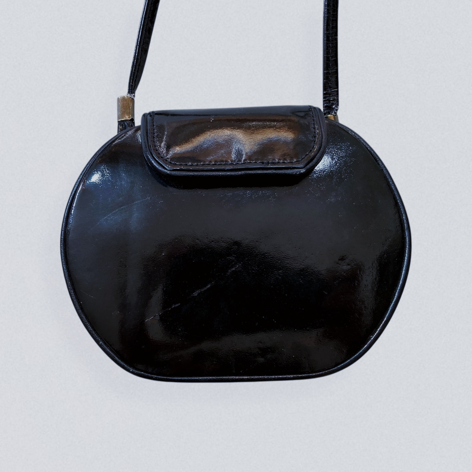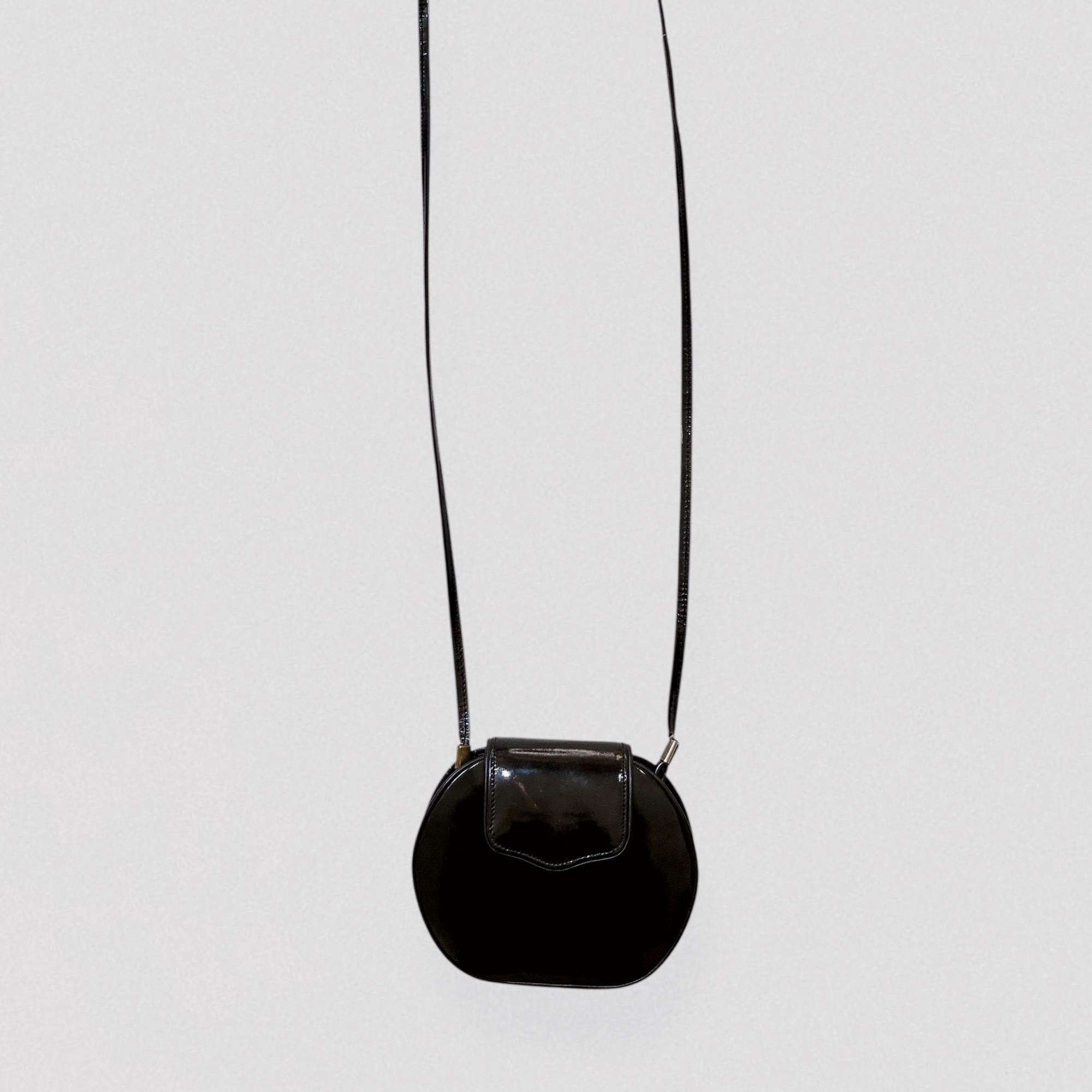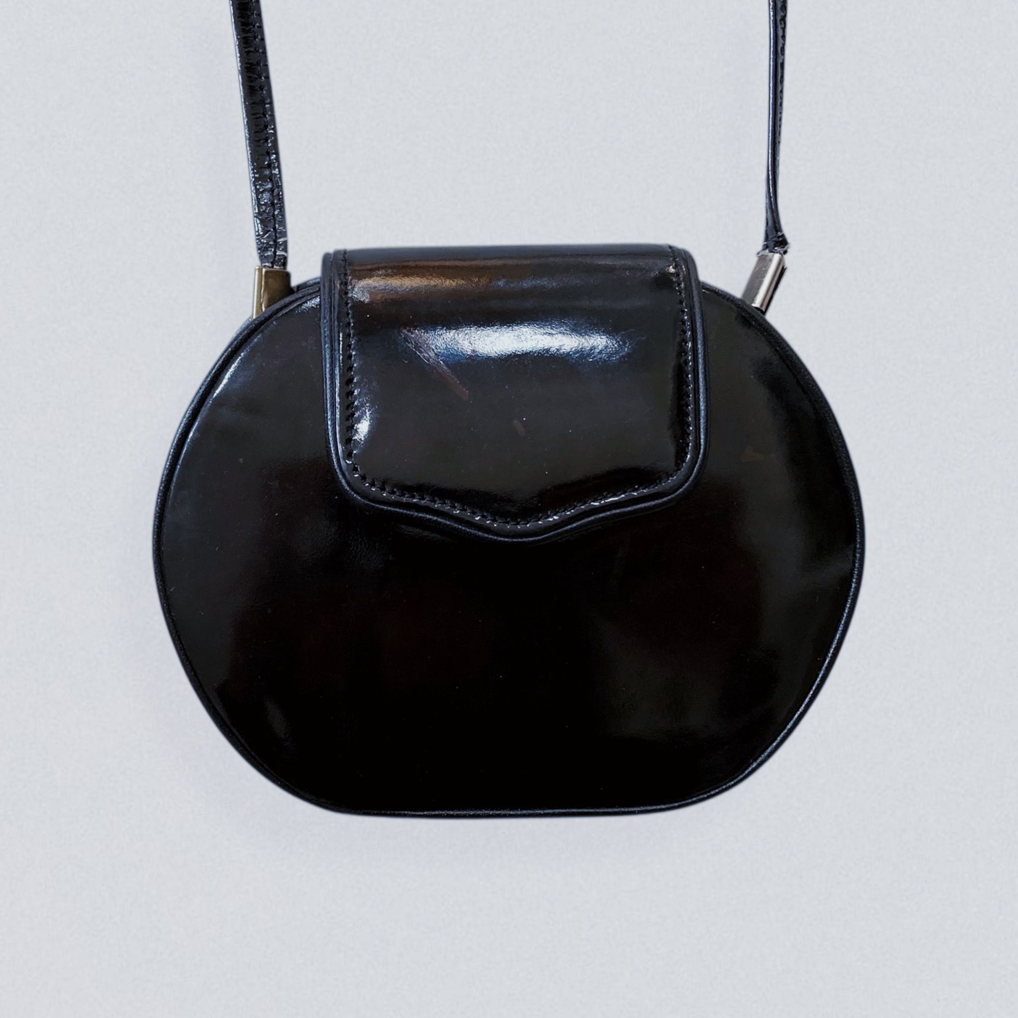 Vintage 1970s oval-shaped mini bag in black vinyl leather by Brazilian brand Eberle. This adorable mini bag features a sleek oval silhouette and a long thin strap, allowing it to be worn on the shoulder or crossbody. It closes with a flap secured by a magnetic button.