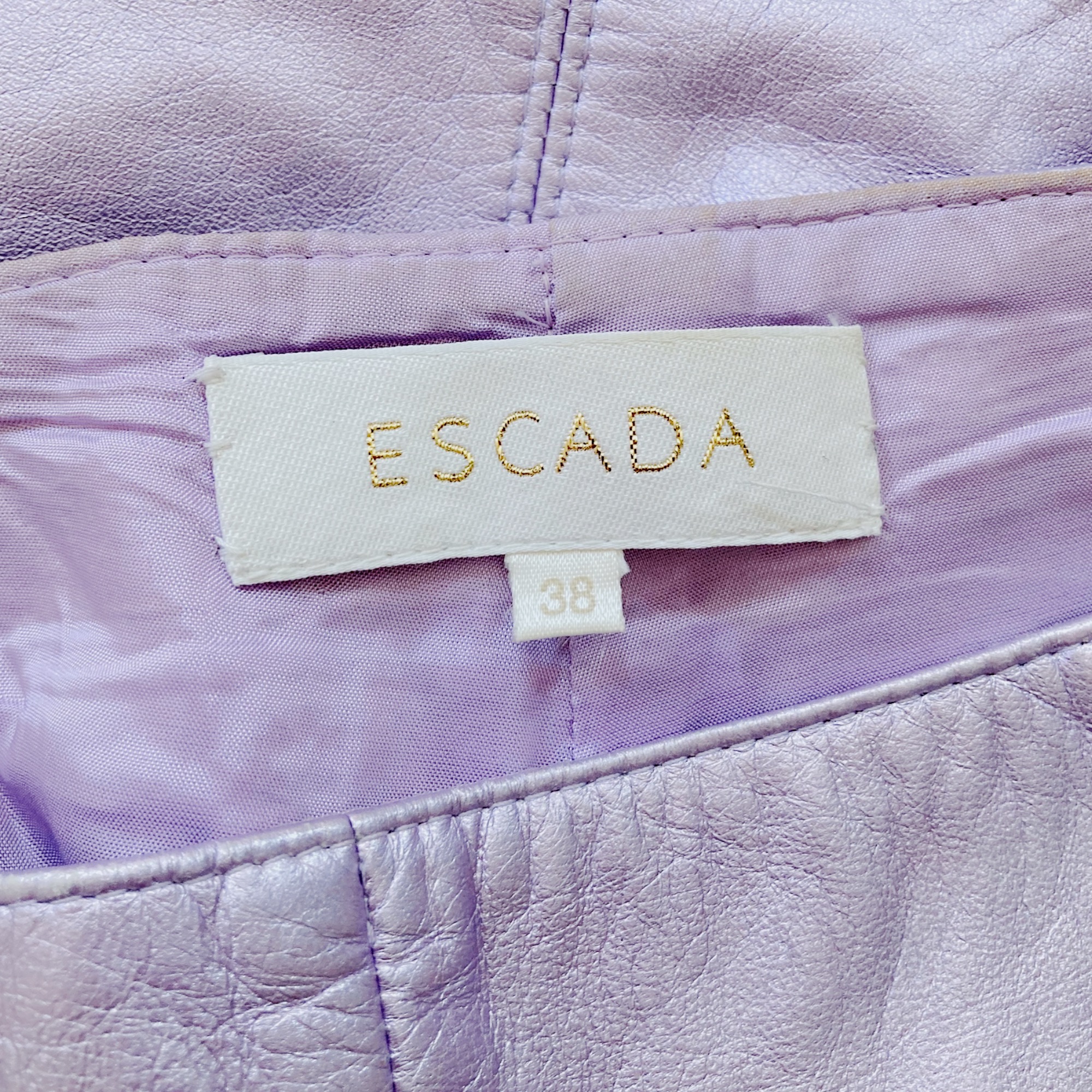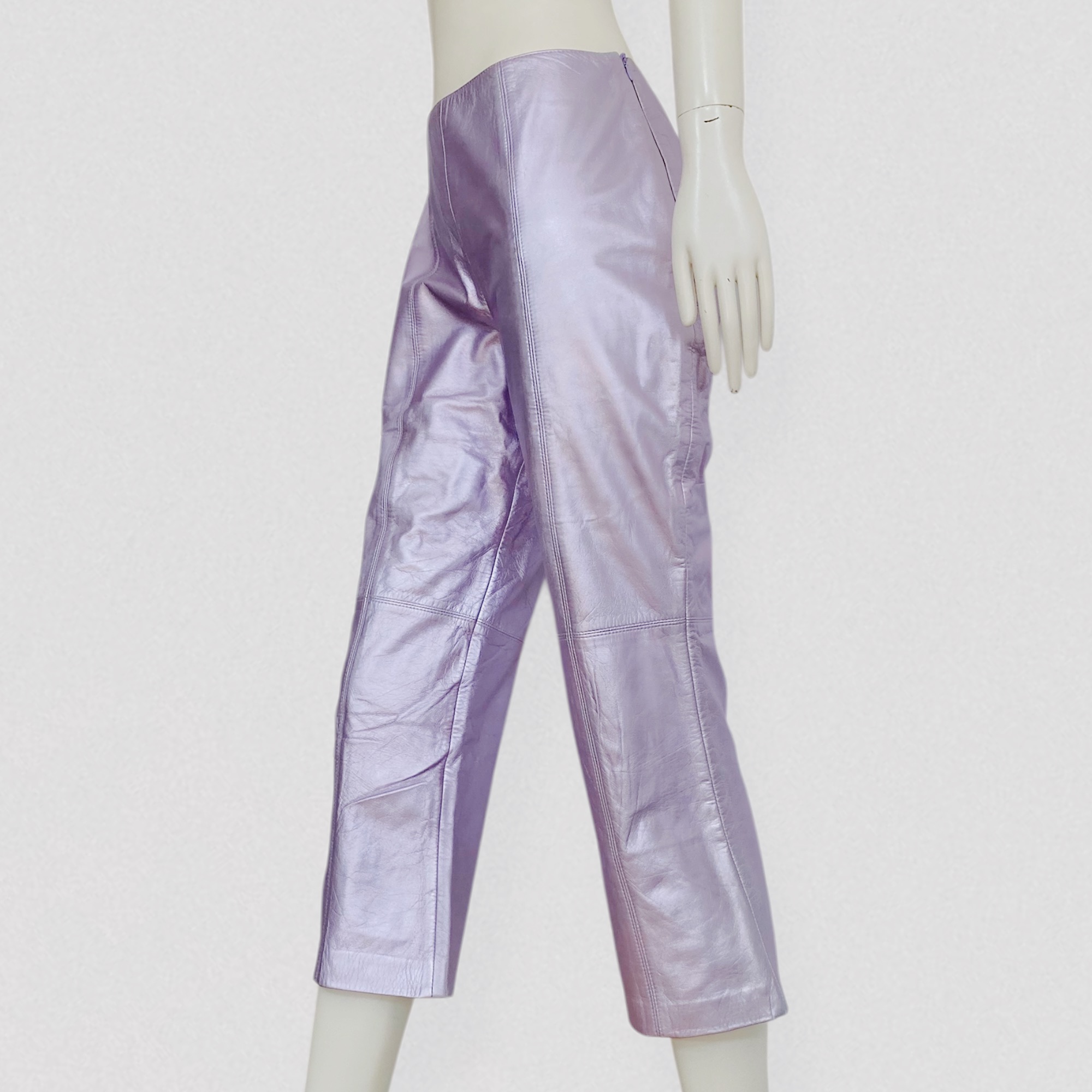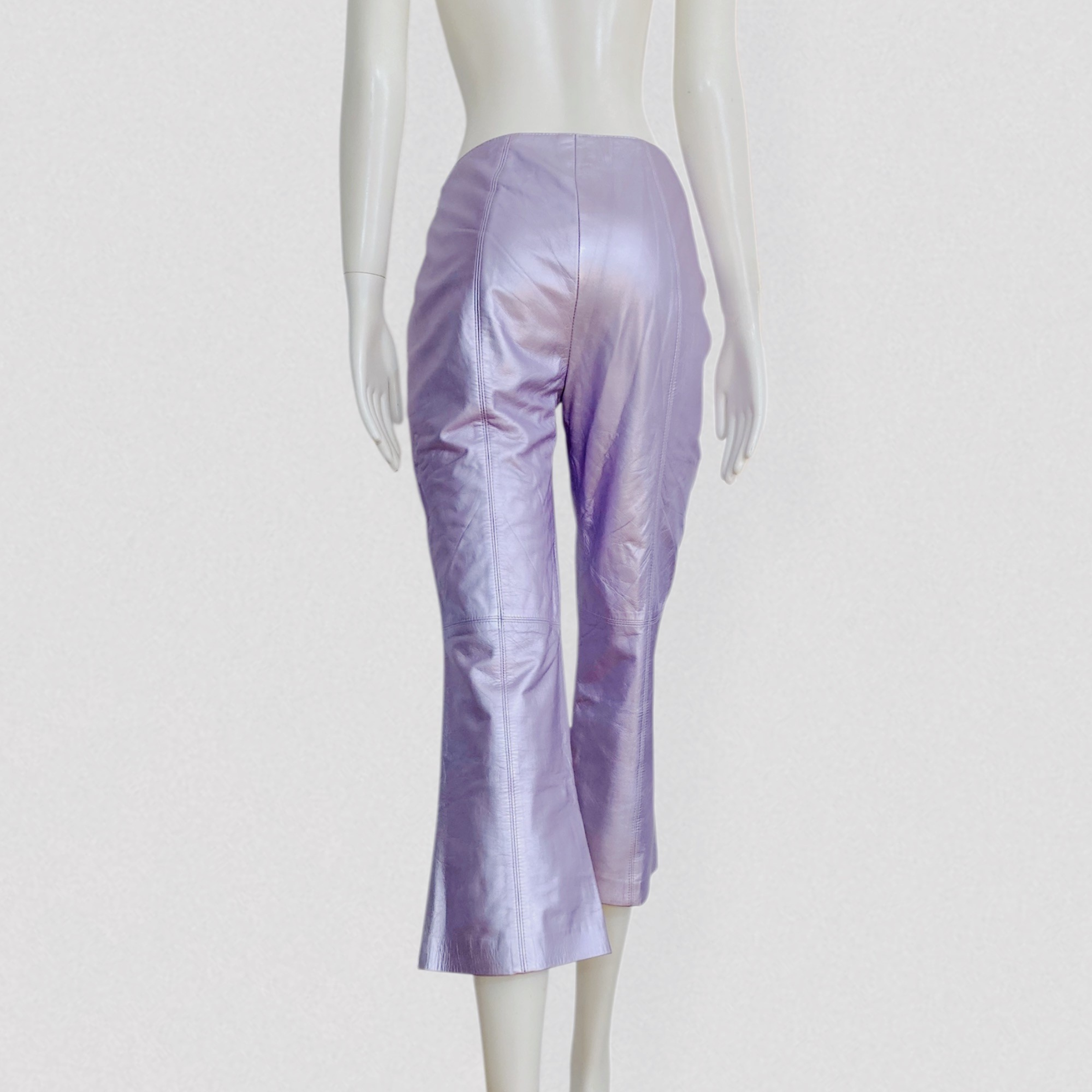 Vintage early 00s cropped leather pants in iridescent pink by the German brand Escada. These striking pants feature an ankle-length silhouette with a slightly flared leg, creating an elegant and modern shape. They are crafted from supple lambskin leather, incredibly soft and comfortable to wear, with a stunning iridescent pink color that catches the light beautifully. The pants close with a side zipper and button and are fully lined for comfort and structure. A rare and eye-catching designer piece.