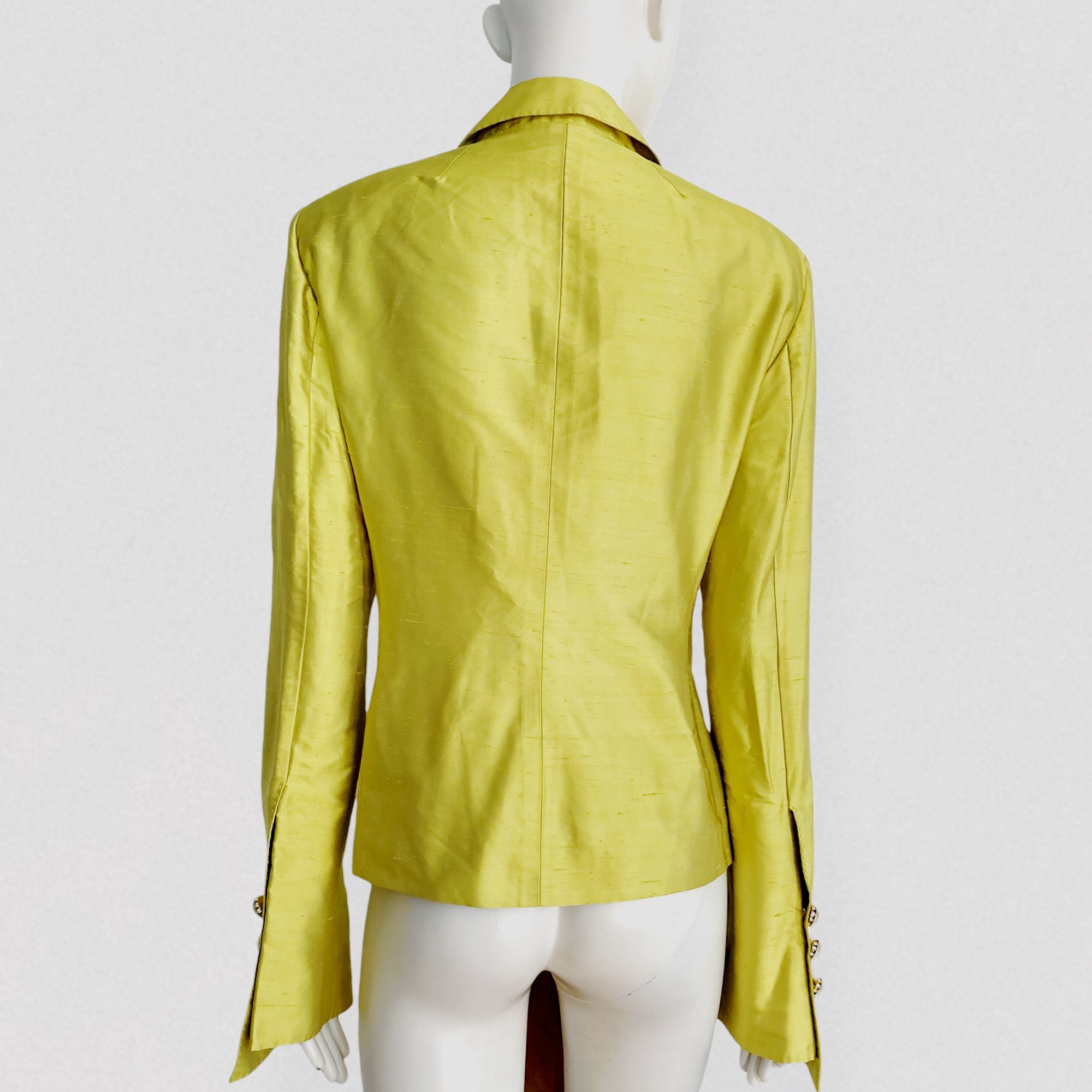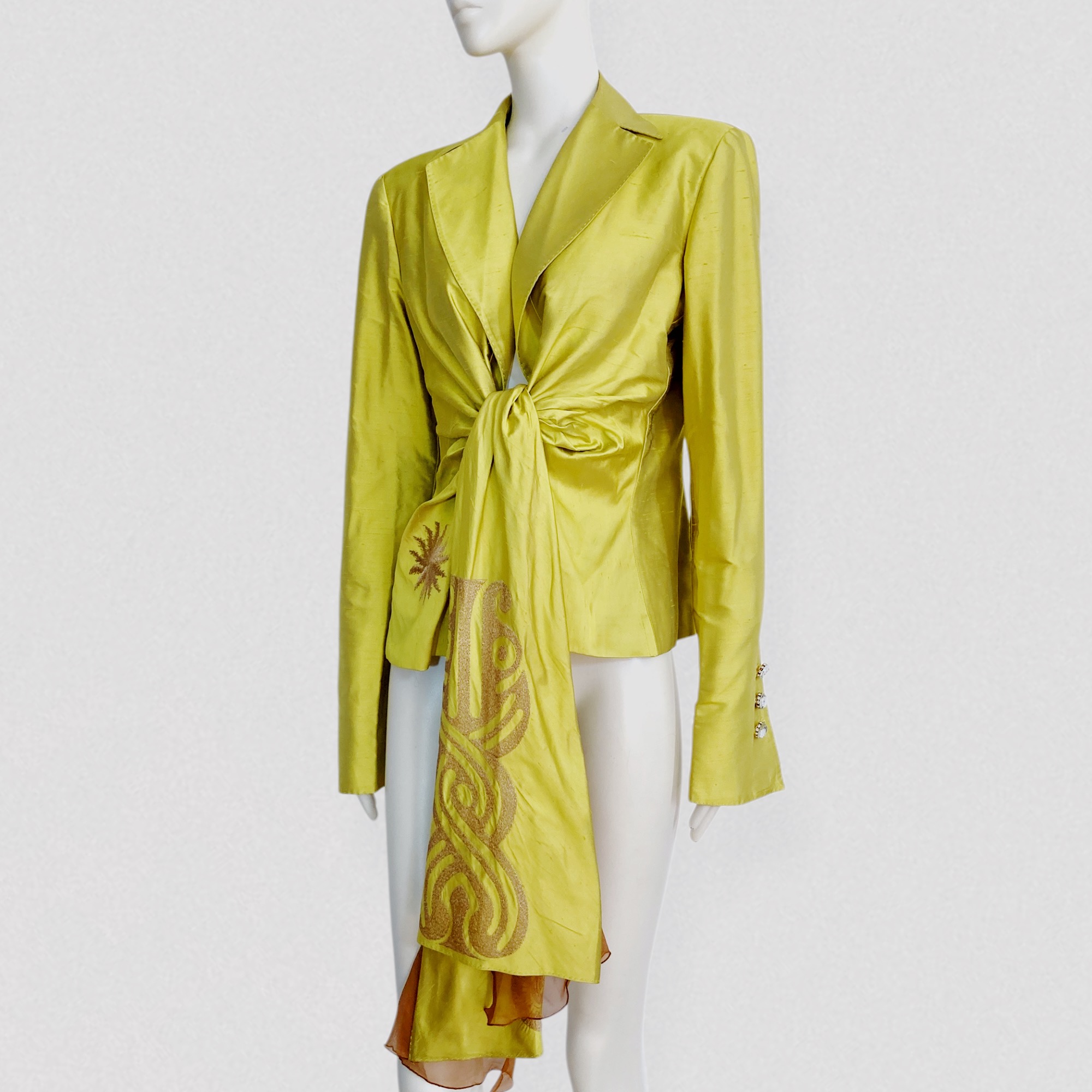 Vintage 90s yellow silk shantung blazer with gold embroidery and integrated belt by the Italian brand Gianfranco Ferré.This striking jacket features a relaxed blazer silhouette with subtle gathers at the waist and a large integrated fabric belt adorned with abstract gold embroidery.The blazer features large silver rhinestone buttons on the sleeves, a gold sun embroidery detail on the lower left front panel, and small shoulder pads that enhance the structured silhouette.It is crafted from a beautiful luminous yellow shantung silk, almost golden in tone, with a crisp and lightweight texture. The jacket is fully lined with brown tulle fabric, adding an unusual couture-like interior detail.A rare archive piece.