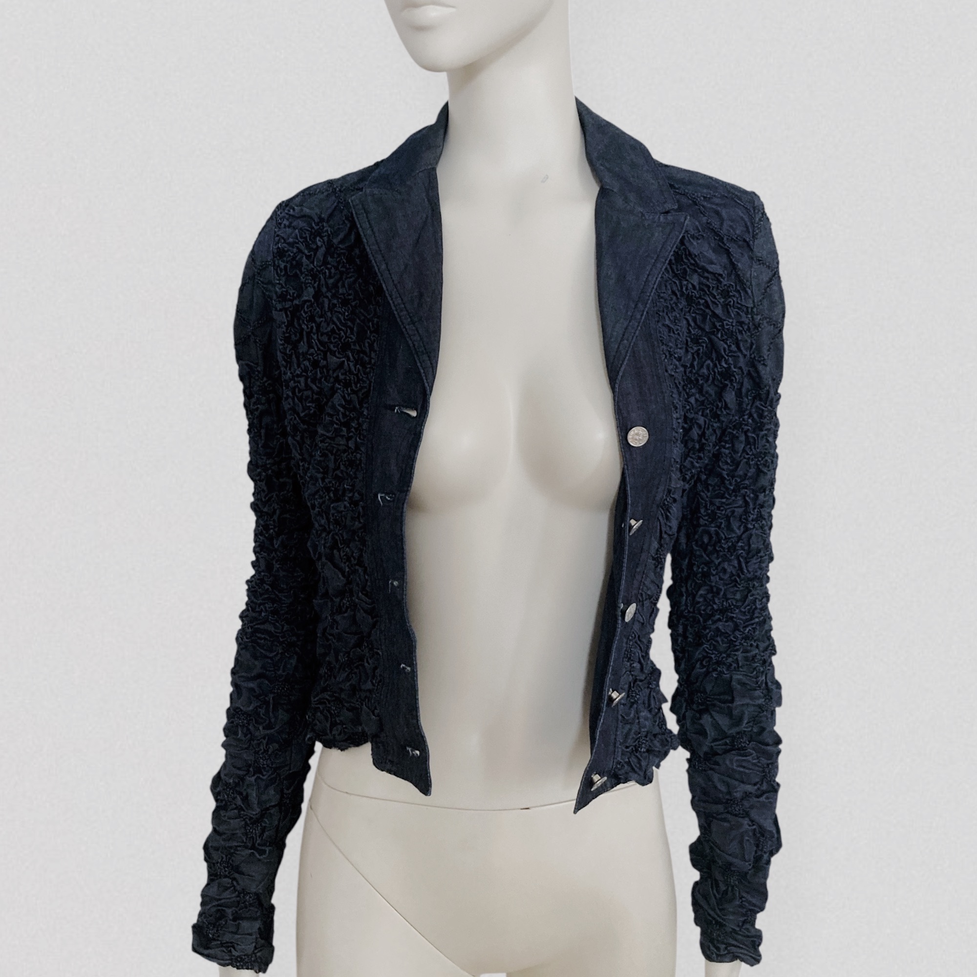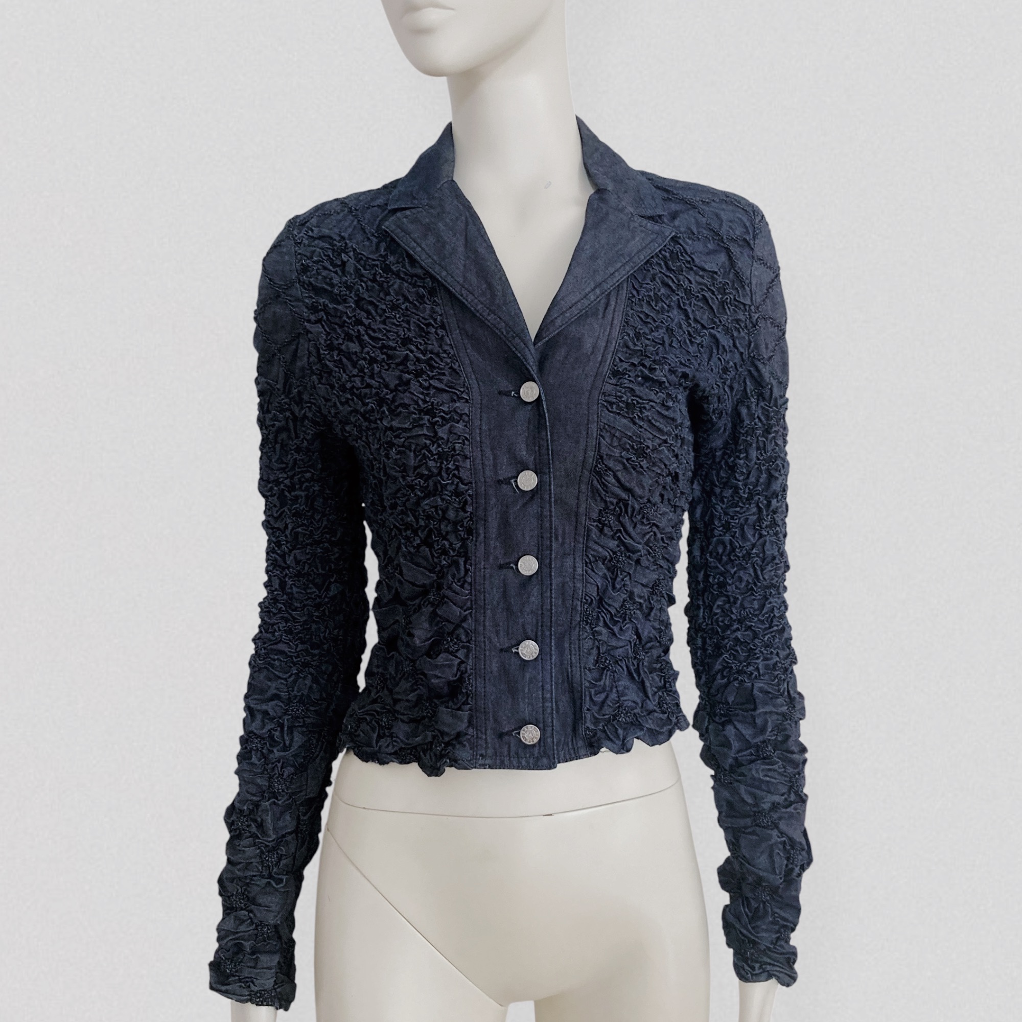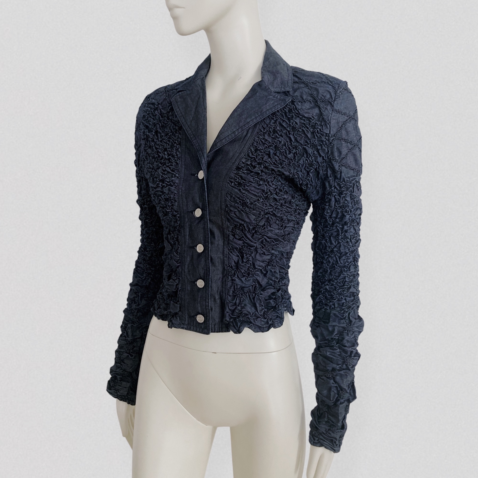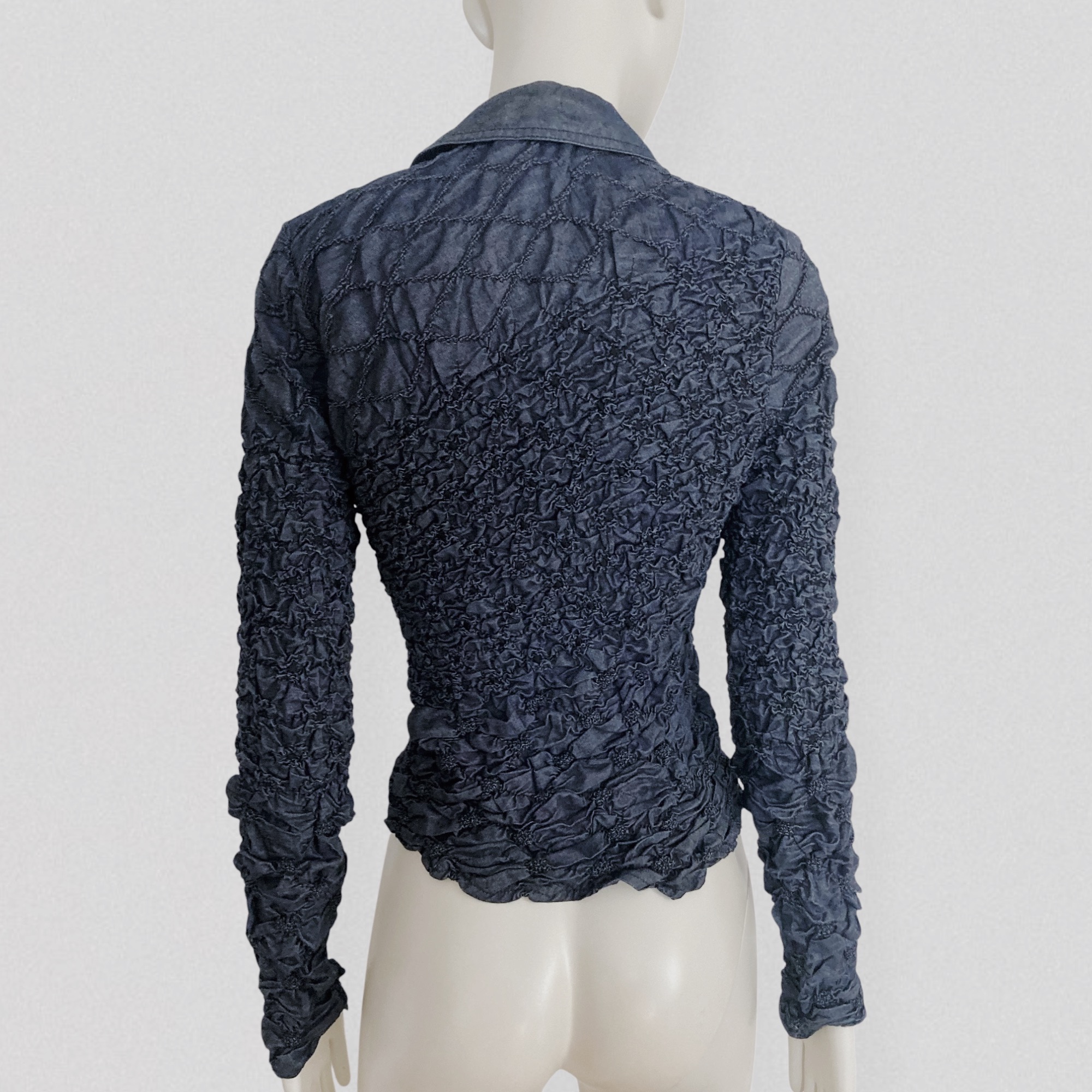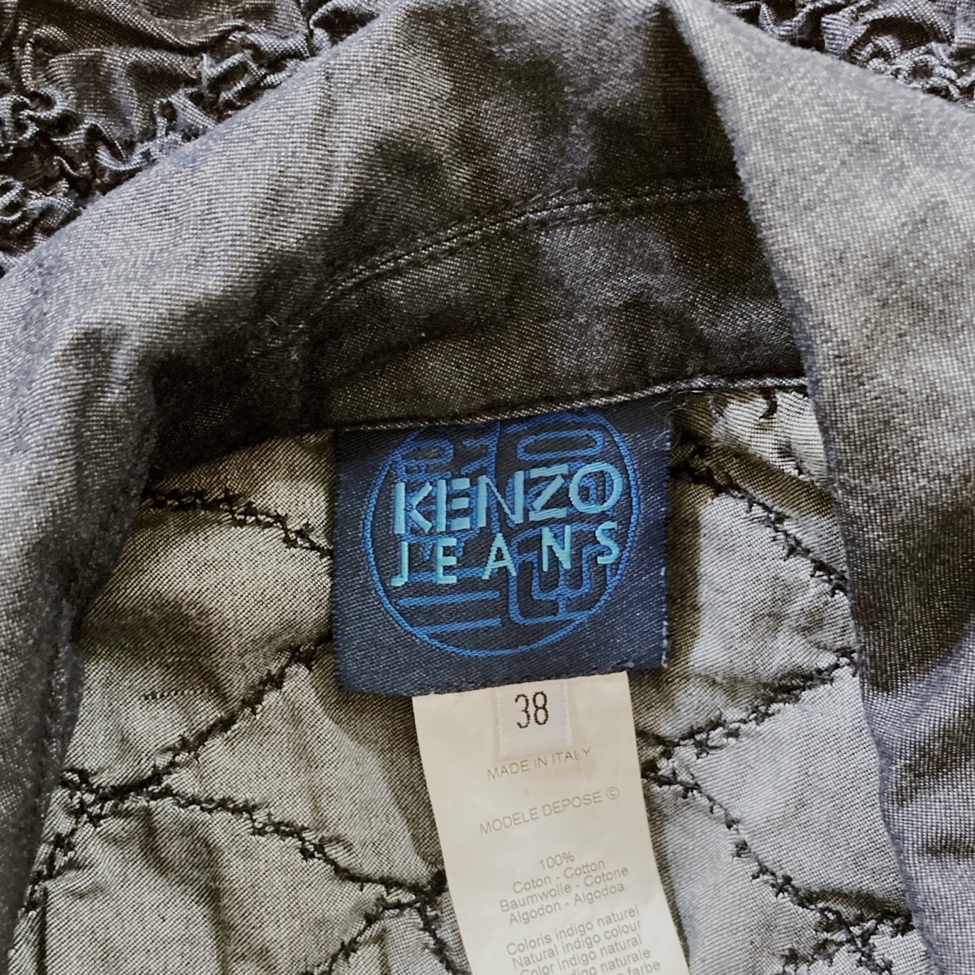 Vintage 90s lightweight denim jacket / overshirt by French brand Kenzo Jeans. Crafted in stretch lightweight denim, this piece features an incredible all-over ruched effect, except for the collar and central placket. It fastens with five silver-tone metal buttons at the front. A rare and striking archival denim design typical of 90s.