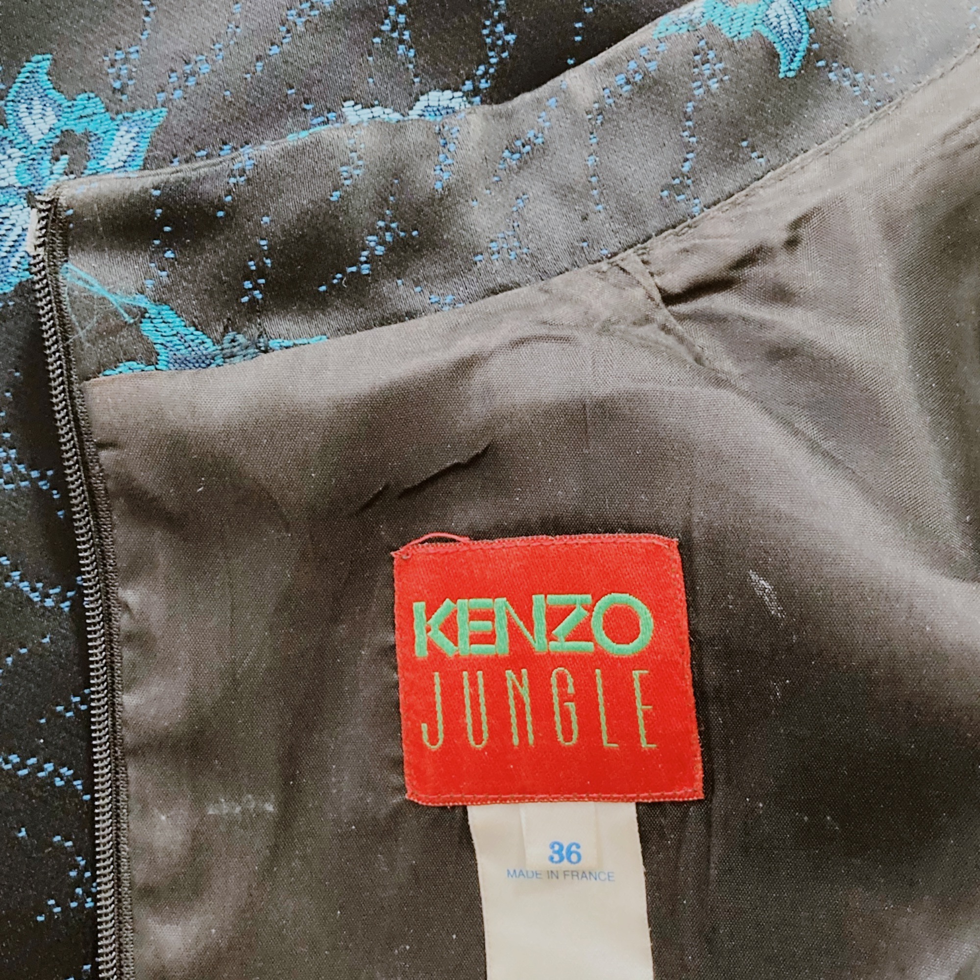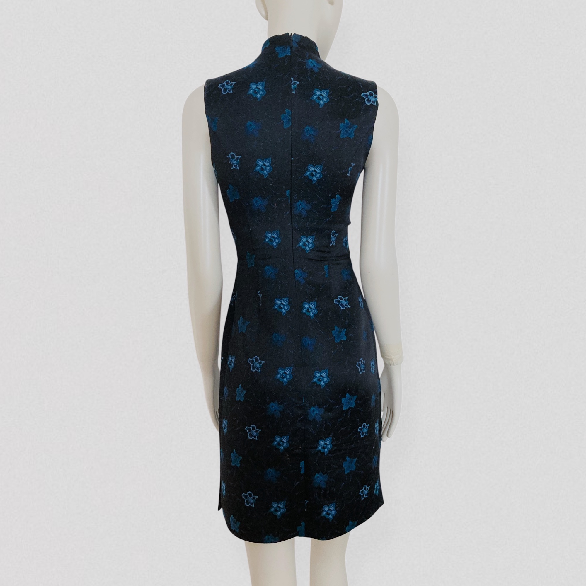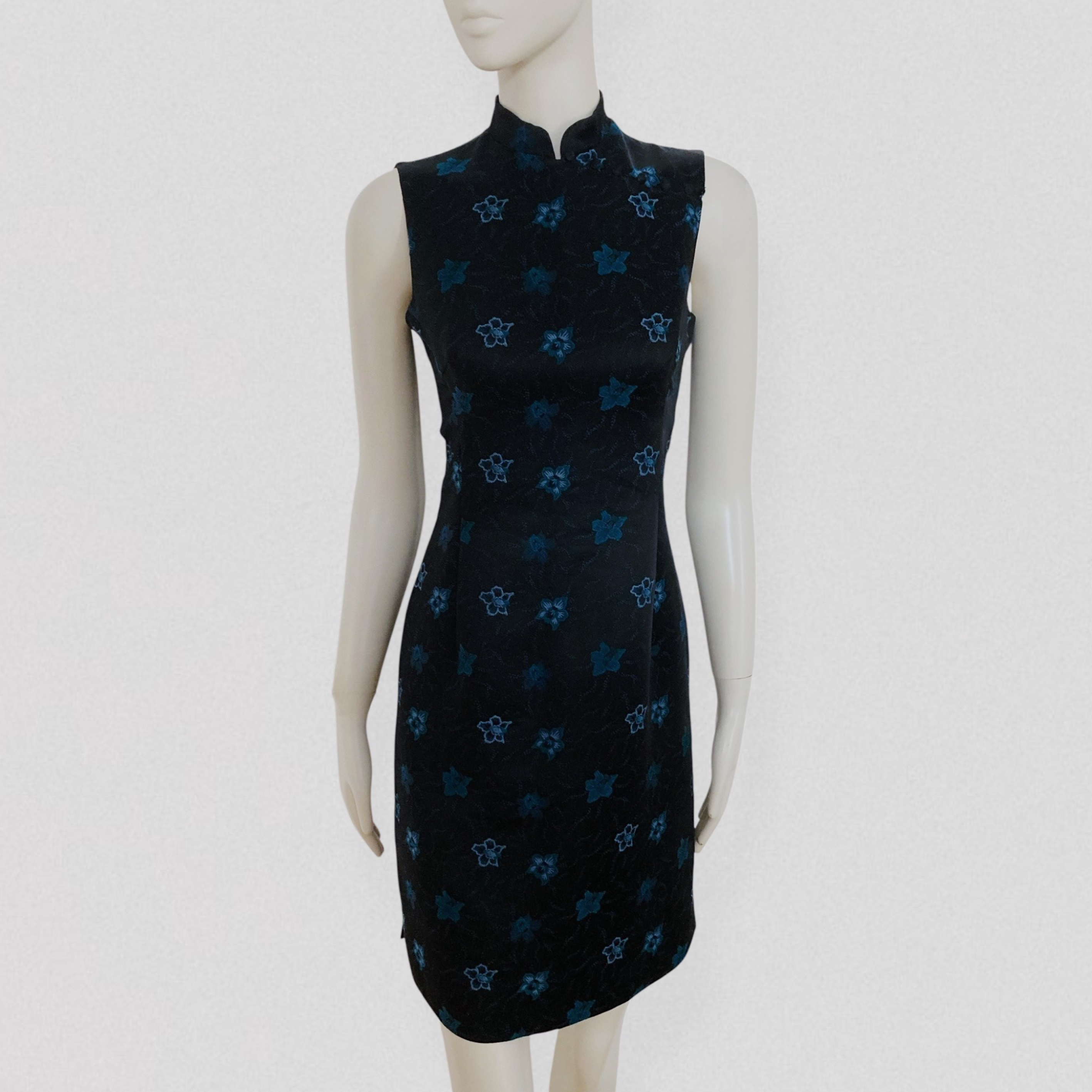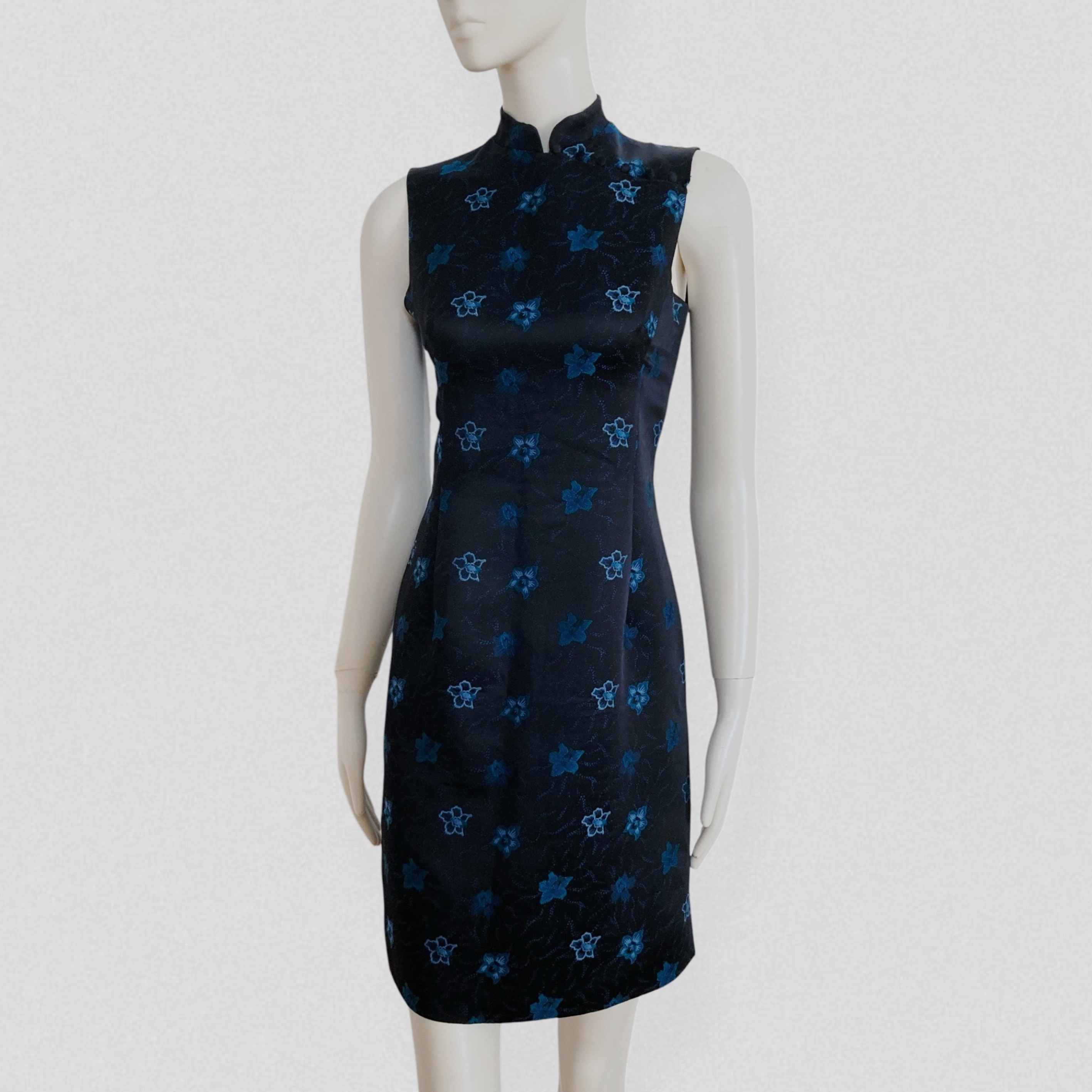 Vintage 90s Chinese-inspired qipao dress by French brand Kenzo Jungle.This fitted midi dress features, a traditional qipao collar adorned with a diagonal row of tonal fabric-covered mini buttons at the upper right chest & two small side slits on the skirt part, echoing classic Chinese dress details. Made in thick black satin with a subtle midnight blue undertone, the fabric is embroidered with delicate blue floral motifs.The dress closes at the back with a central zipper.