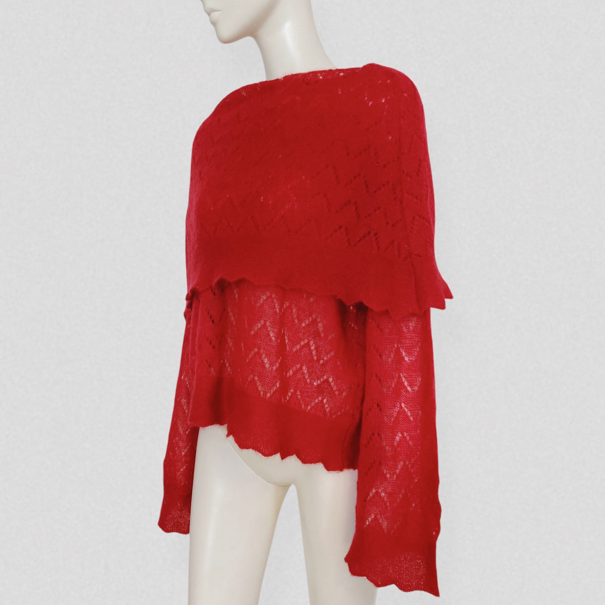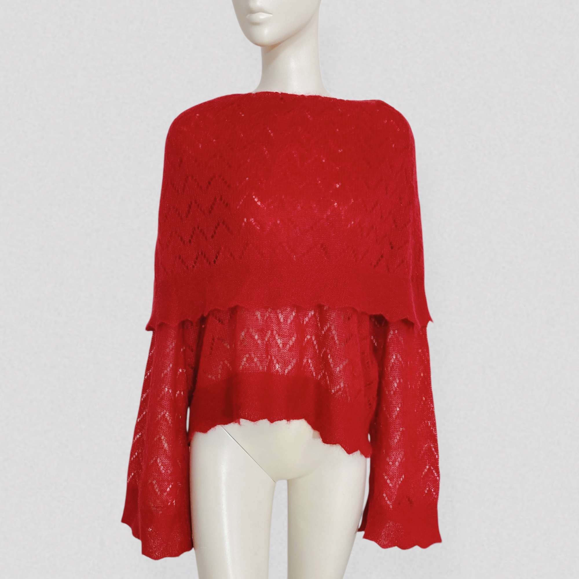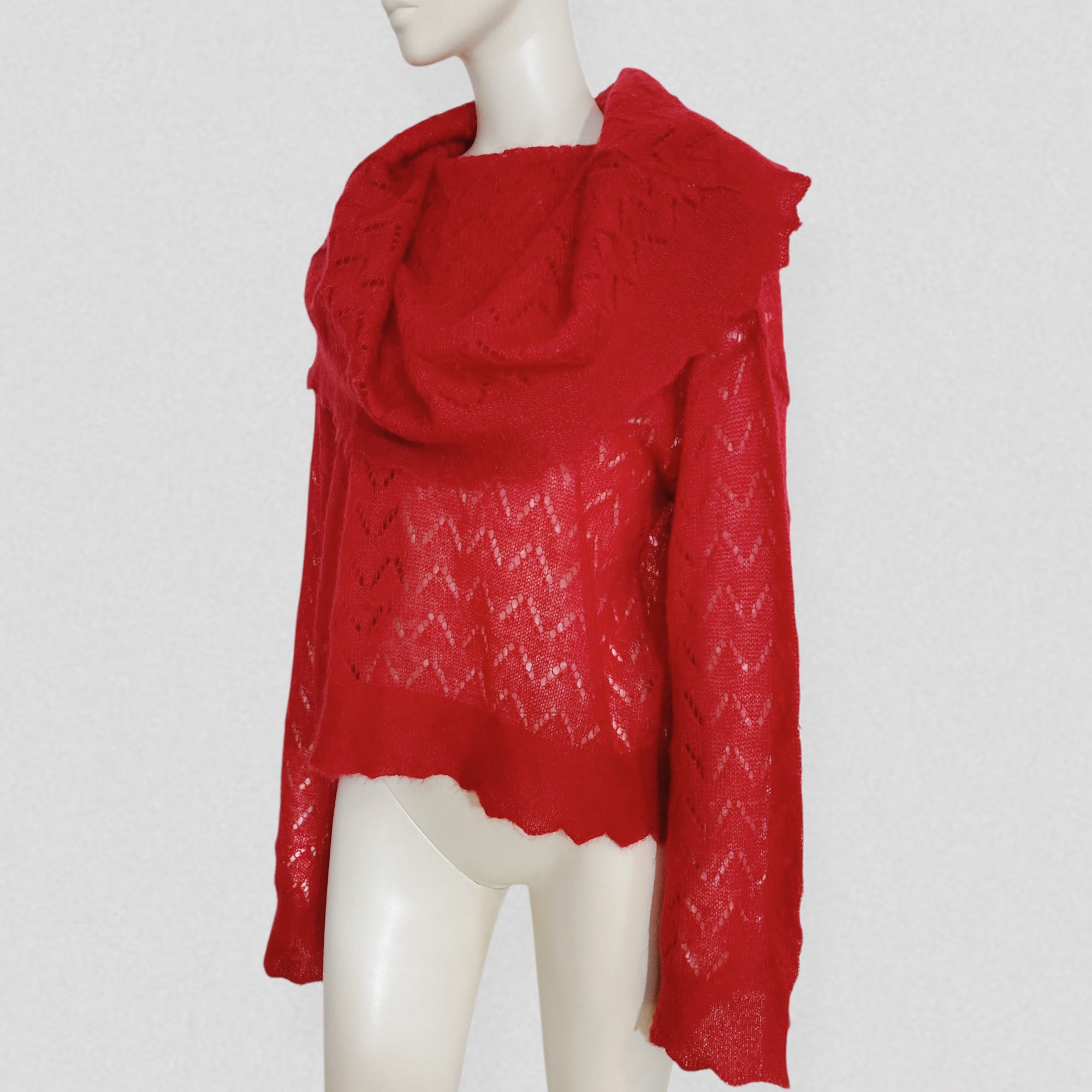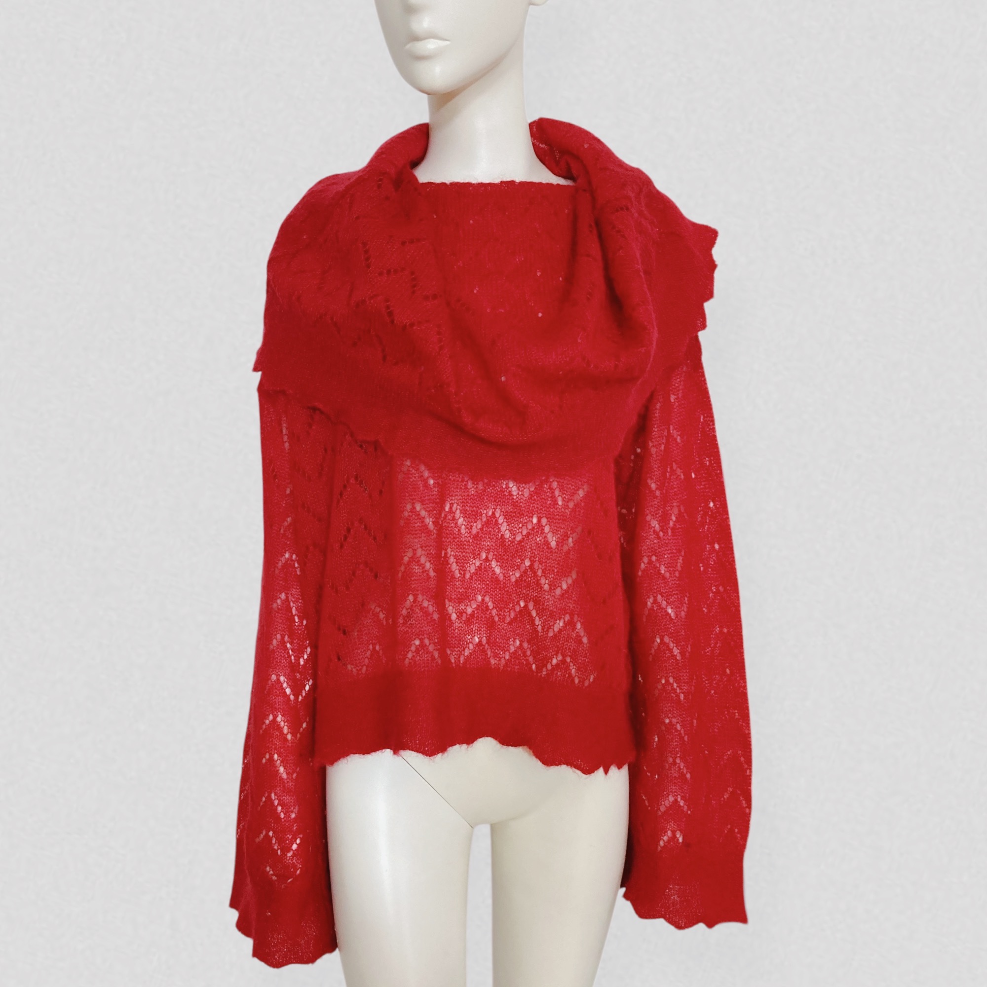 Vintage early 00s semi-sheer red wool sweater with openwork pattern & scarf collar by French brand Kenzo. The sweater features a loose fit, dramatic pagoda sleeves, and a extra large fold-over scarf/cape collar that can be styled in multiple ways. It is crafted from vibrant red wool that is both warm and lightweight, worked to create a semi-sheer effect and enhanced with a beautiful openwork chevron motif.
