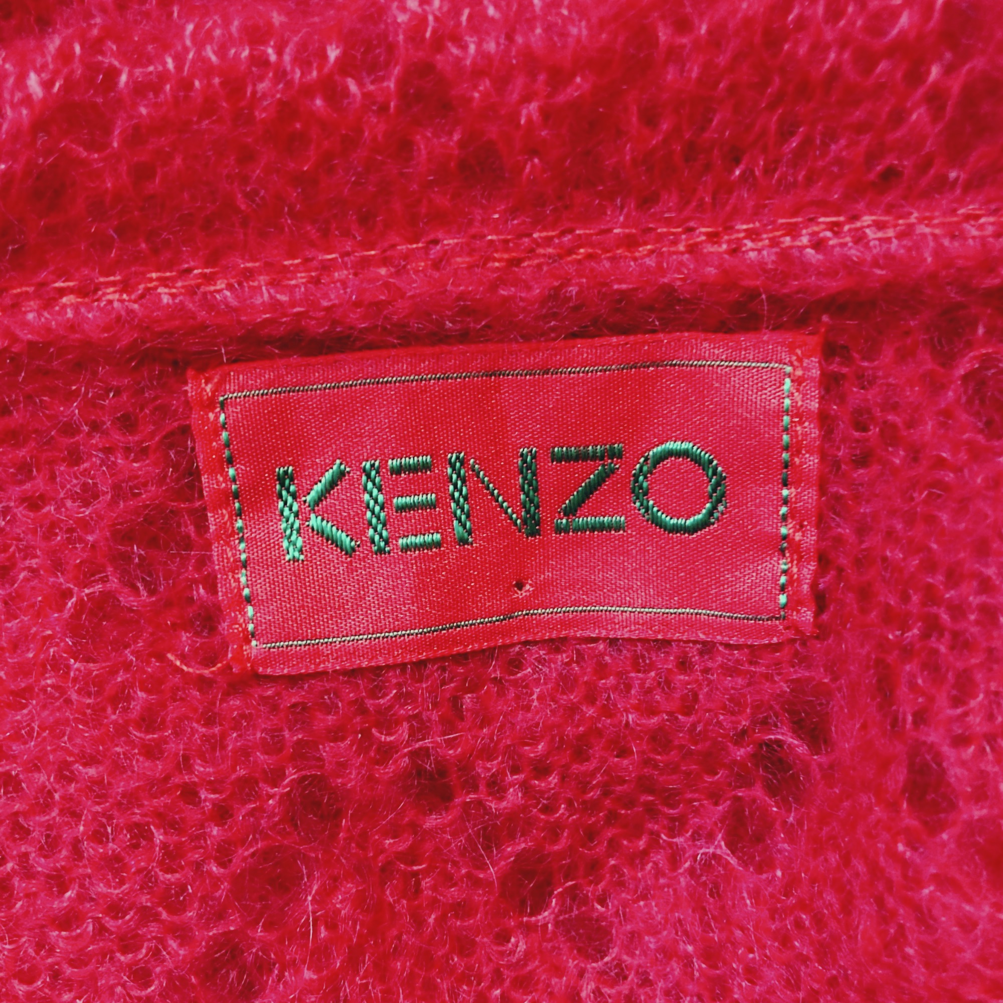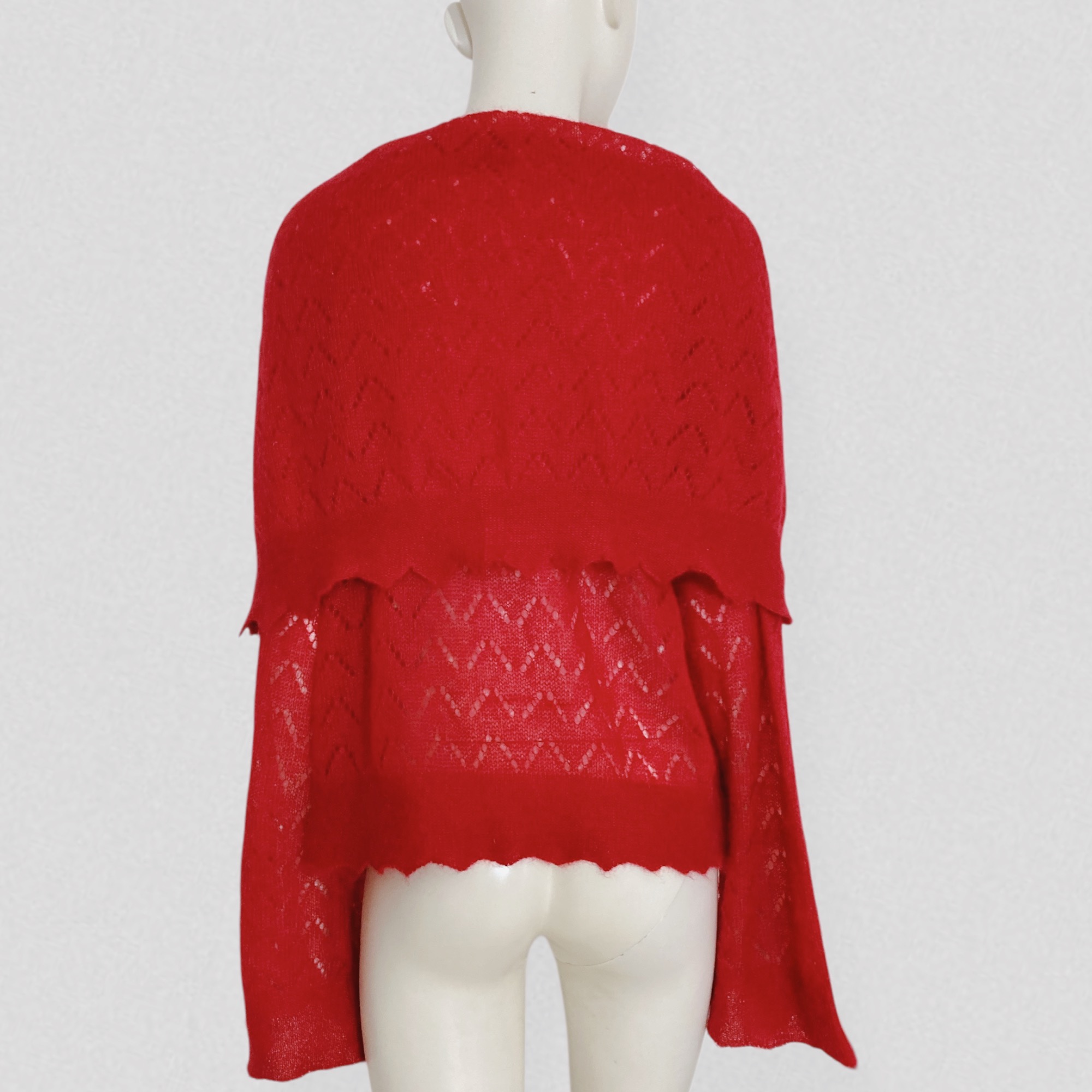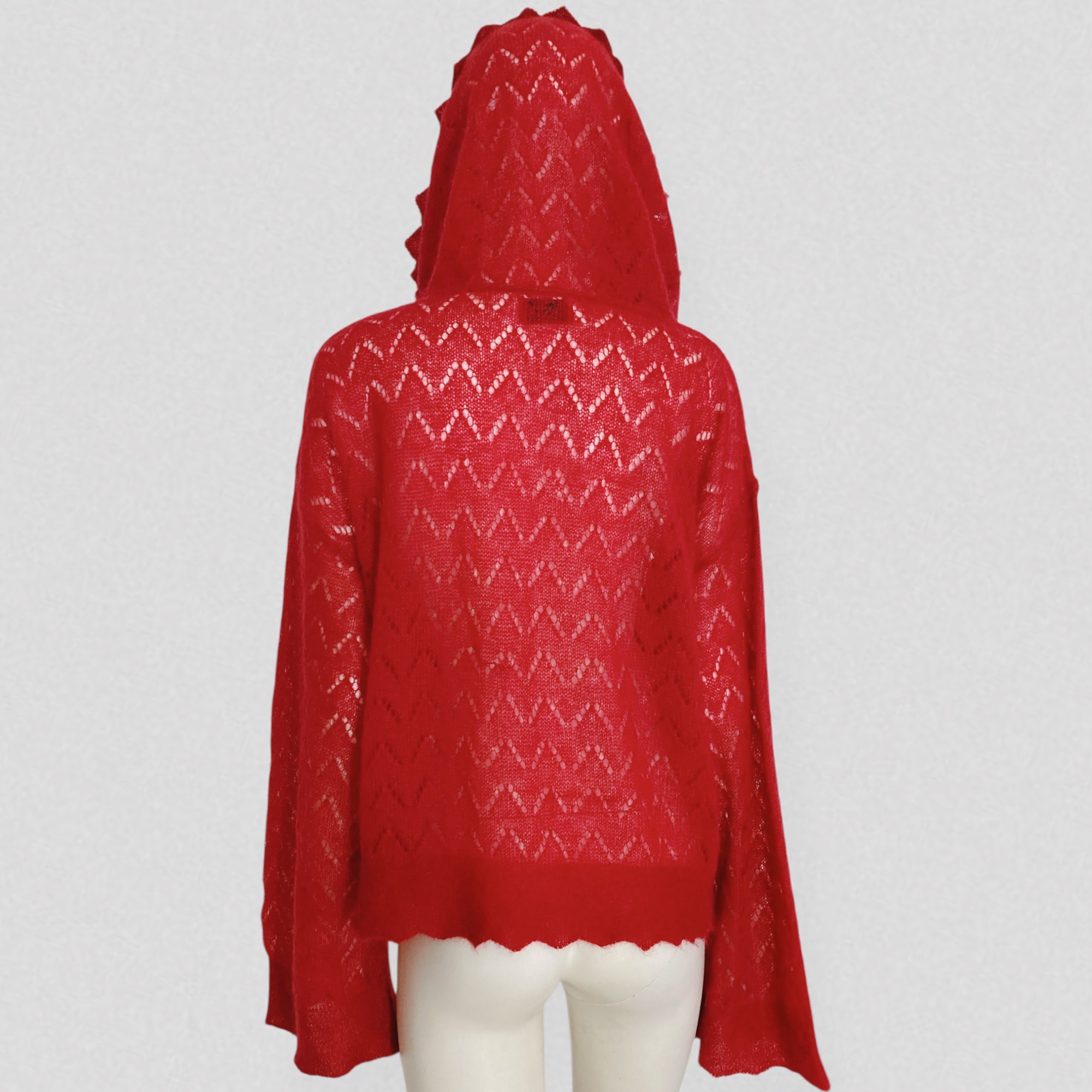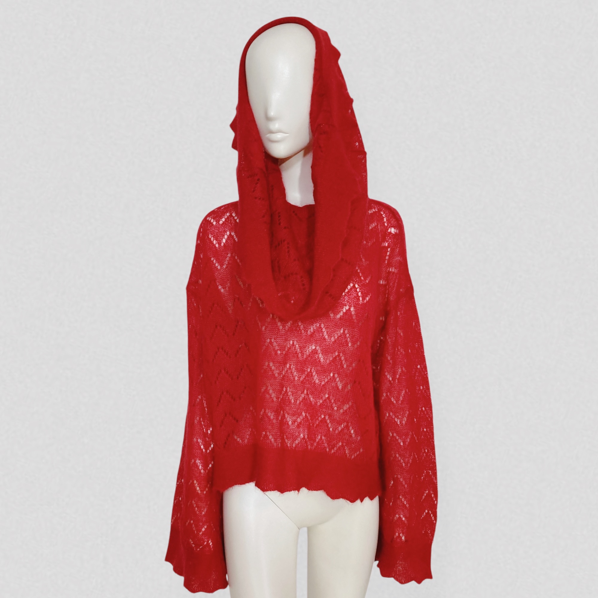 Vintage early 00s semi-sheer red wool sweater with openwork pattern & scarf collar by French brand Kenzo. The sweater features a loose fit, dramatic pagoda sleeves, and a extra large fold-over scarf/cape collar that can be styled in multiple ways. It is crafted from vibrant red wool that is both warm and lightweight, worked to create a semi-sheer effect and enhanced with a beautiful openwork chevron motif.