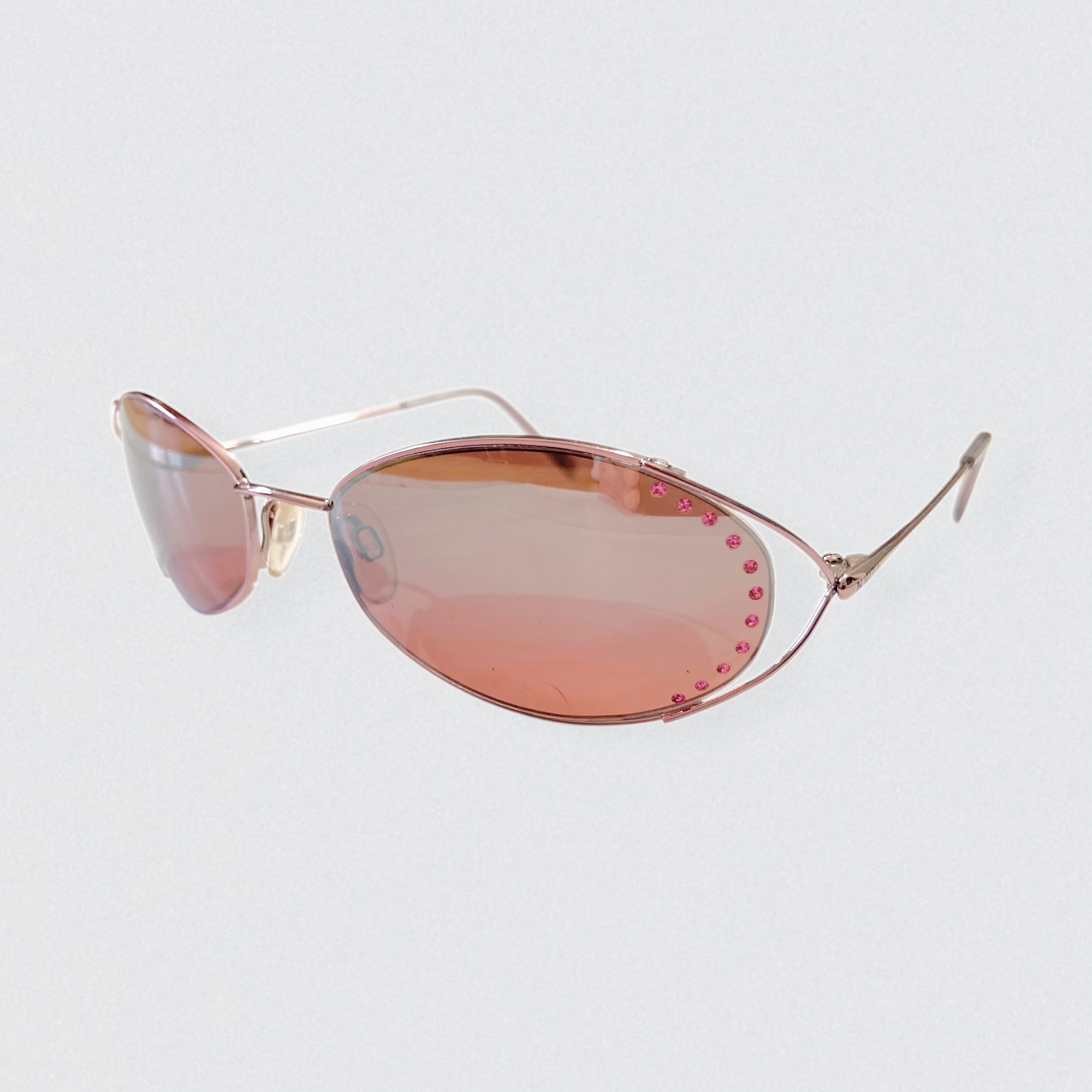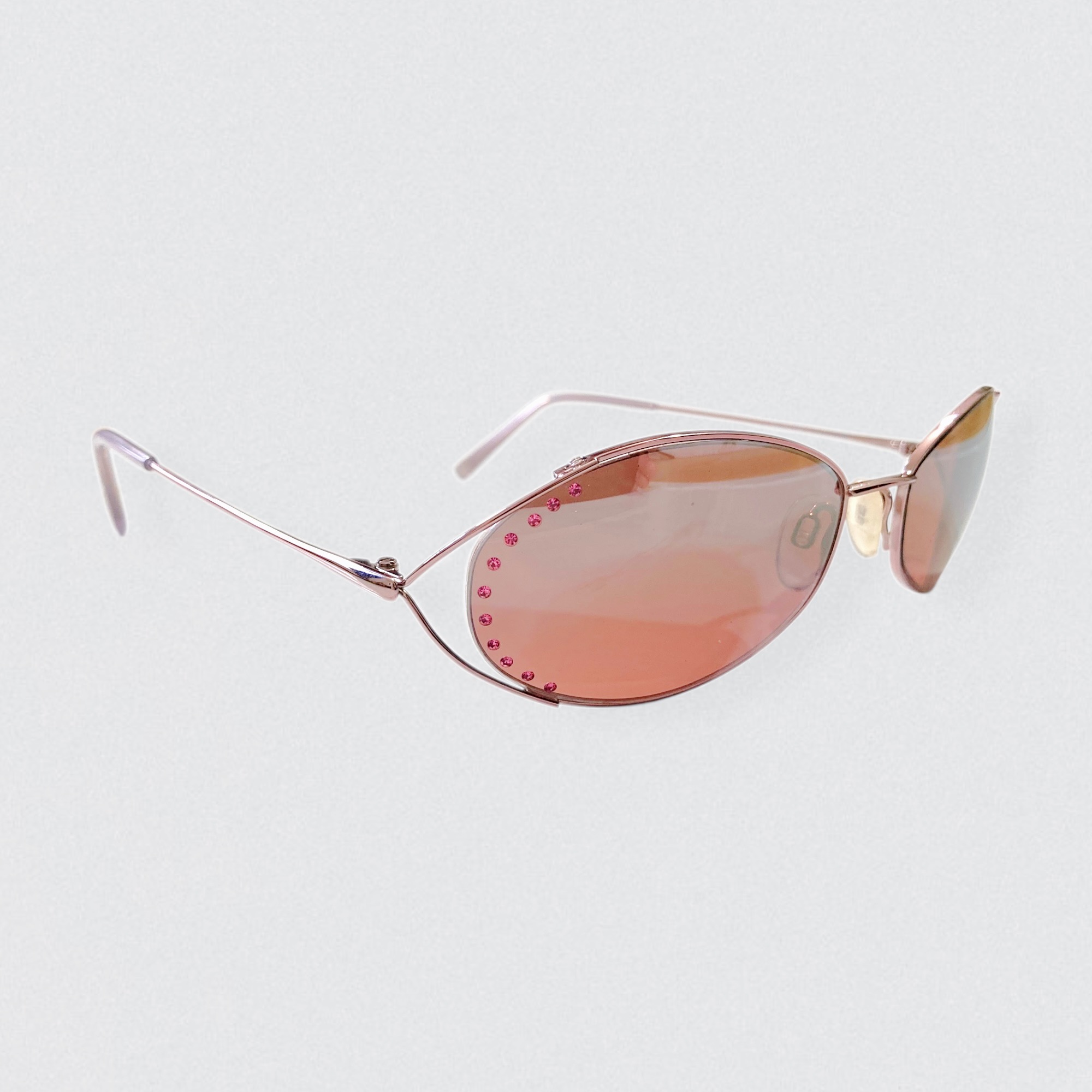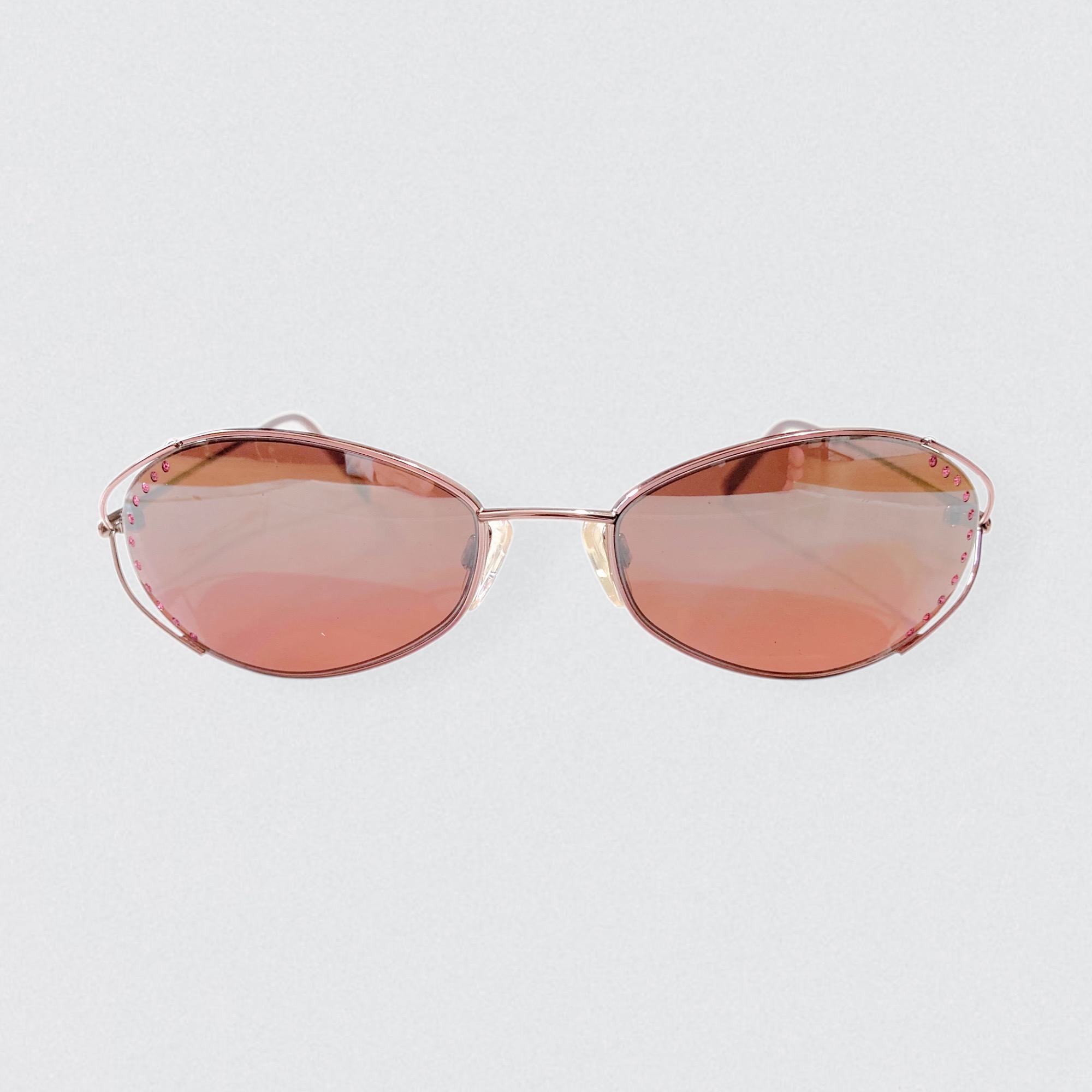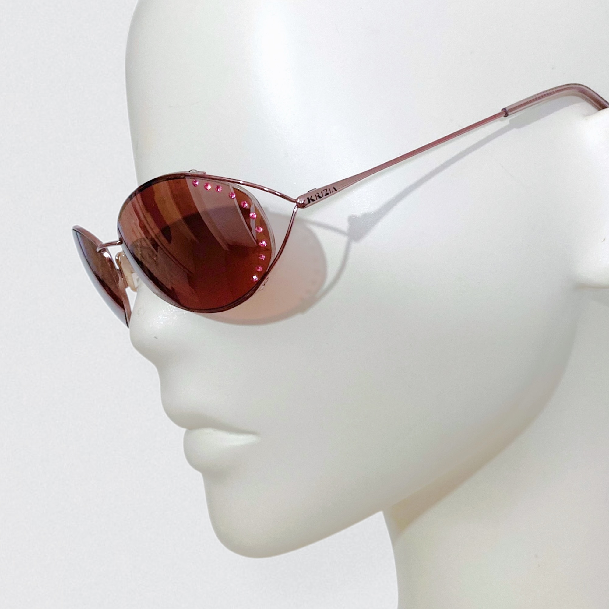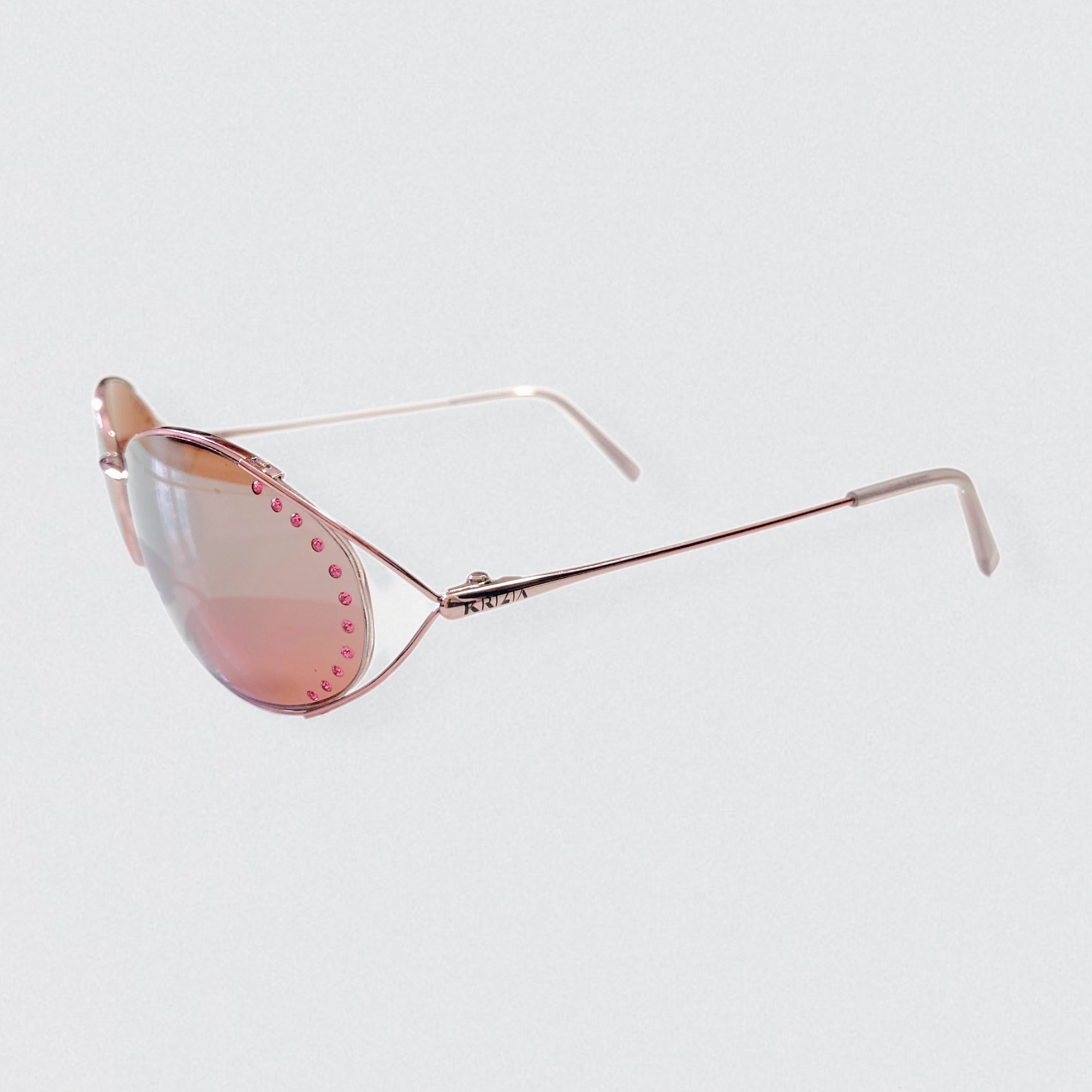 Vintage 90s sunglasses by the Italian brand Krizia, decorated with pink rhinestones on the lenses. These sunglasses are made of copper-colored metal & feature oval-shaped lenses embellished with tiny pink rhinestones along the outer edges.