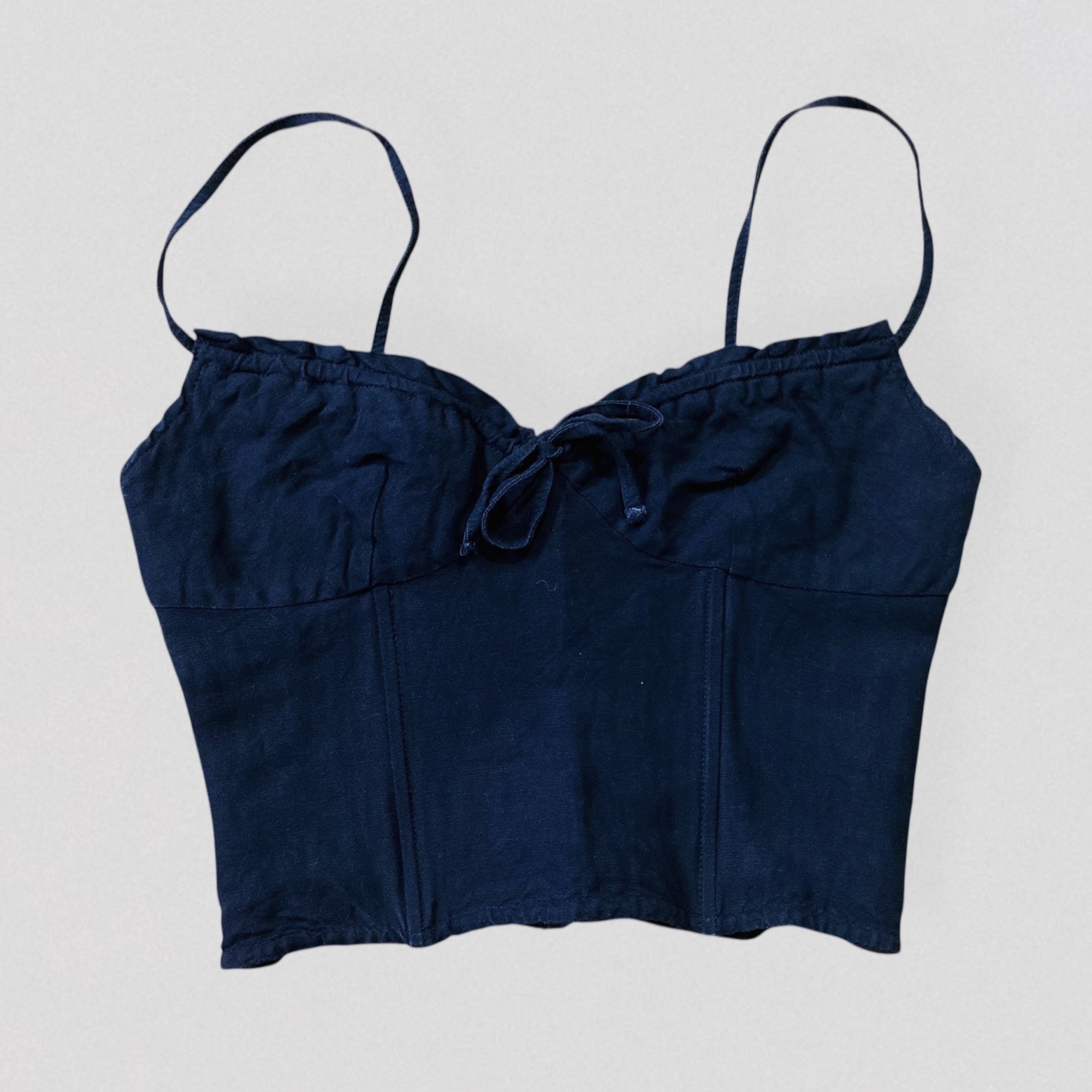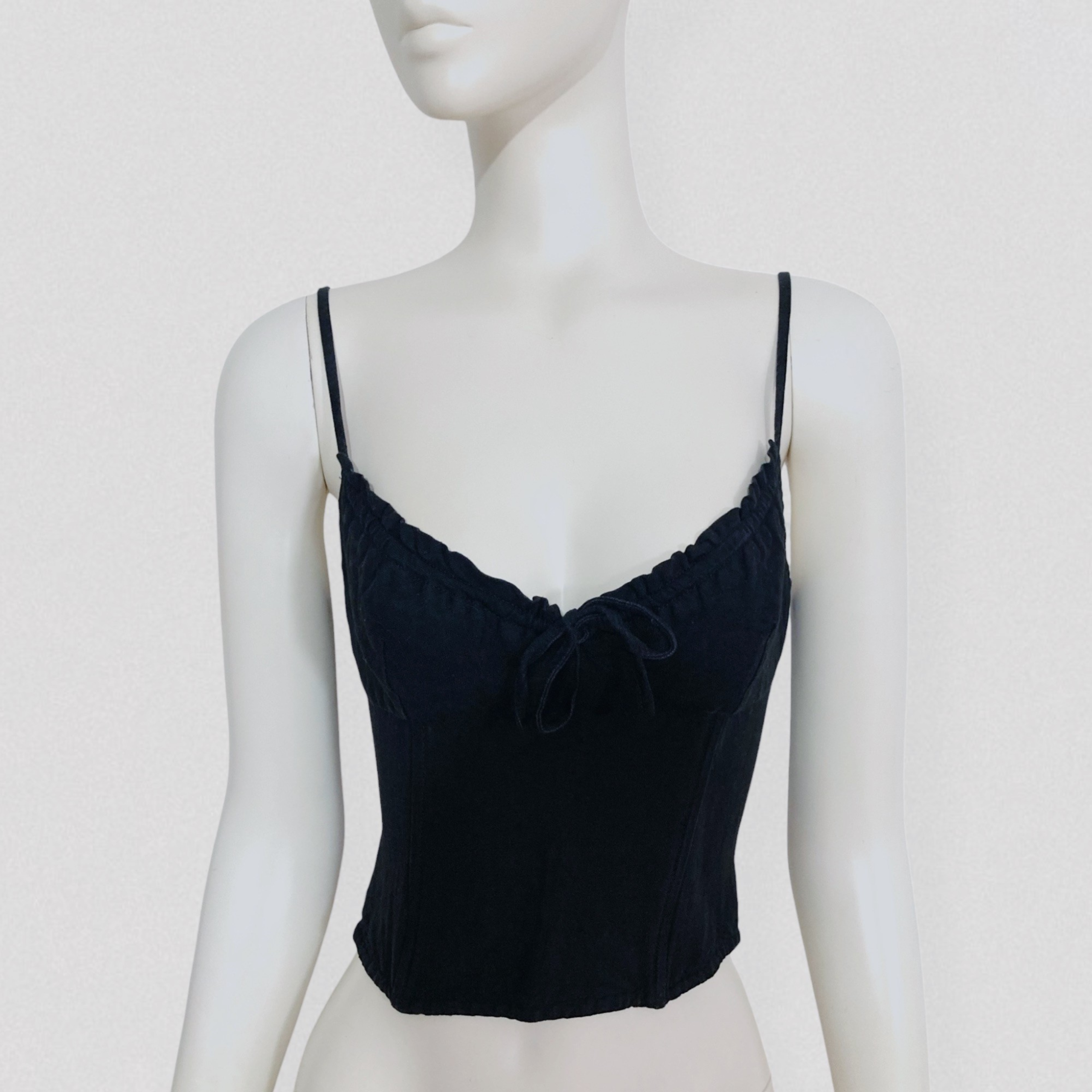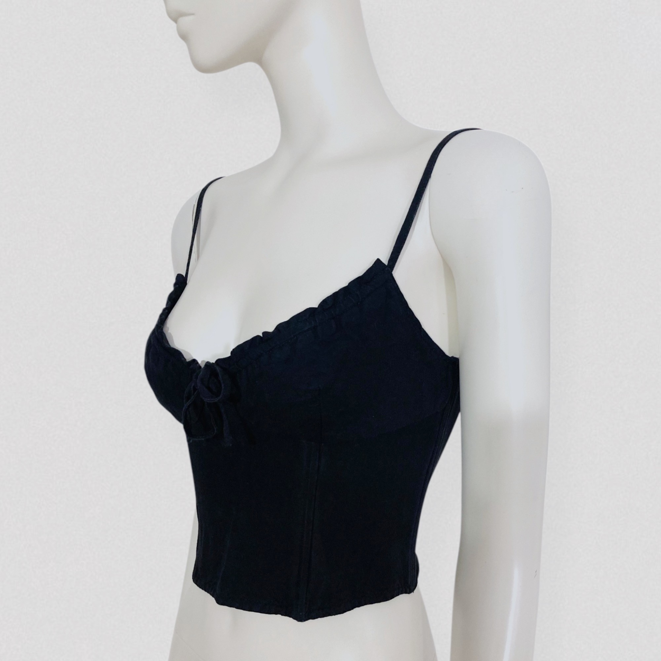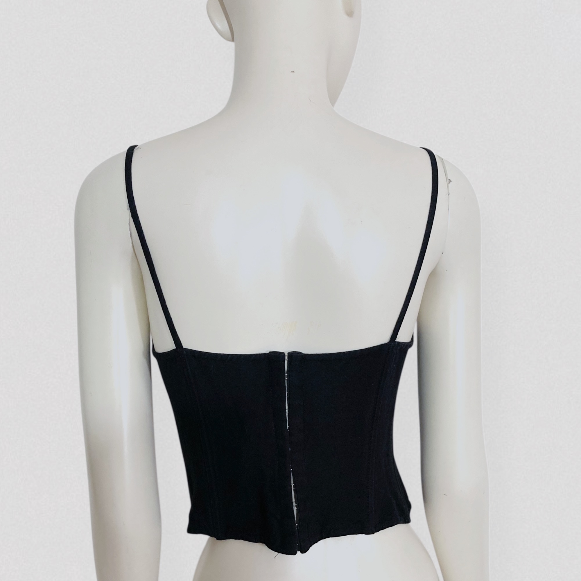Vintage early 90s black linen crop bustier top by the French brand Lolita Lempicka, Bis line. This fitted crop bustier features a flattering sweetheart neckline and thin straps. Boning around the waist provides structure and a flattering silhouette. It closes at the back with a row of small hooks.