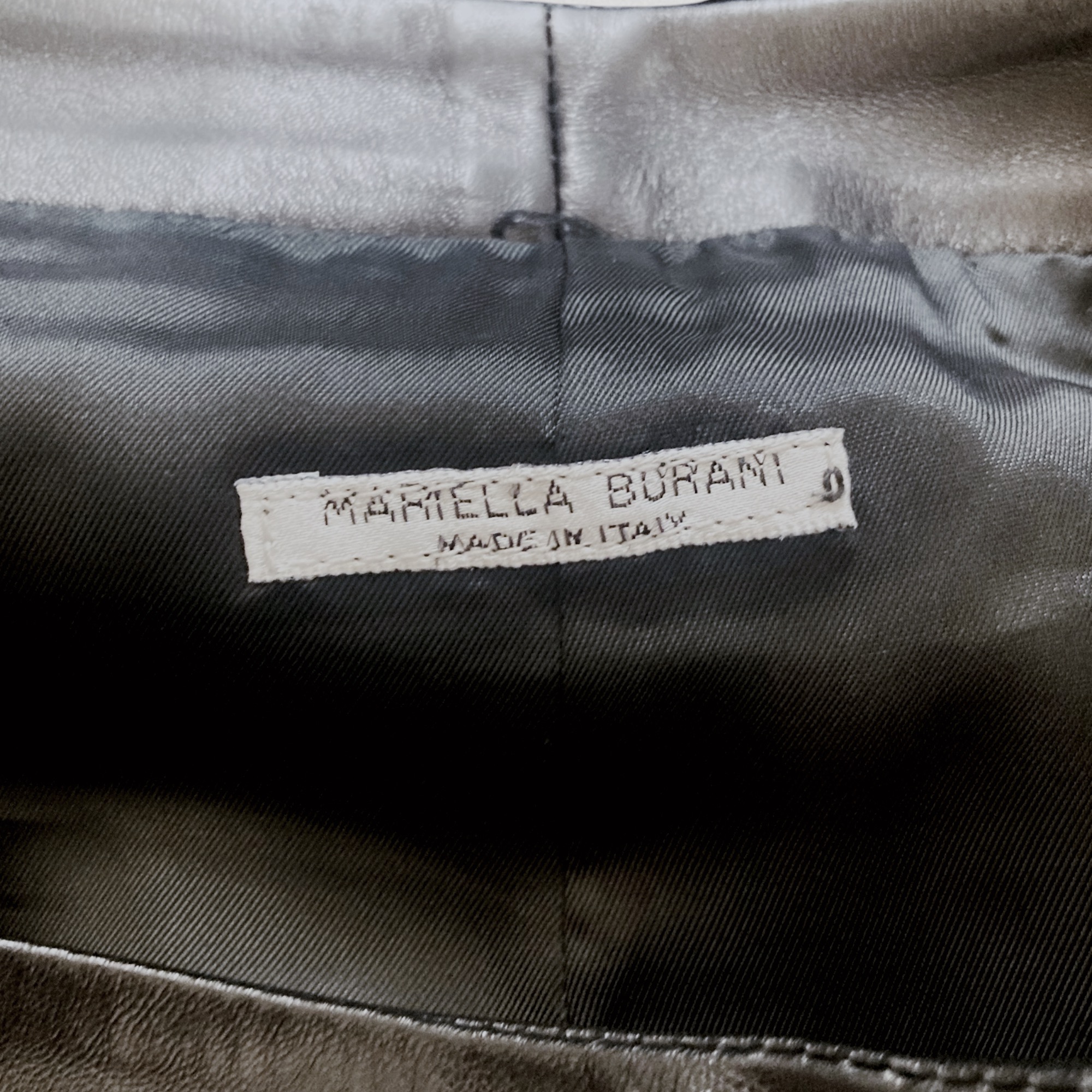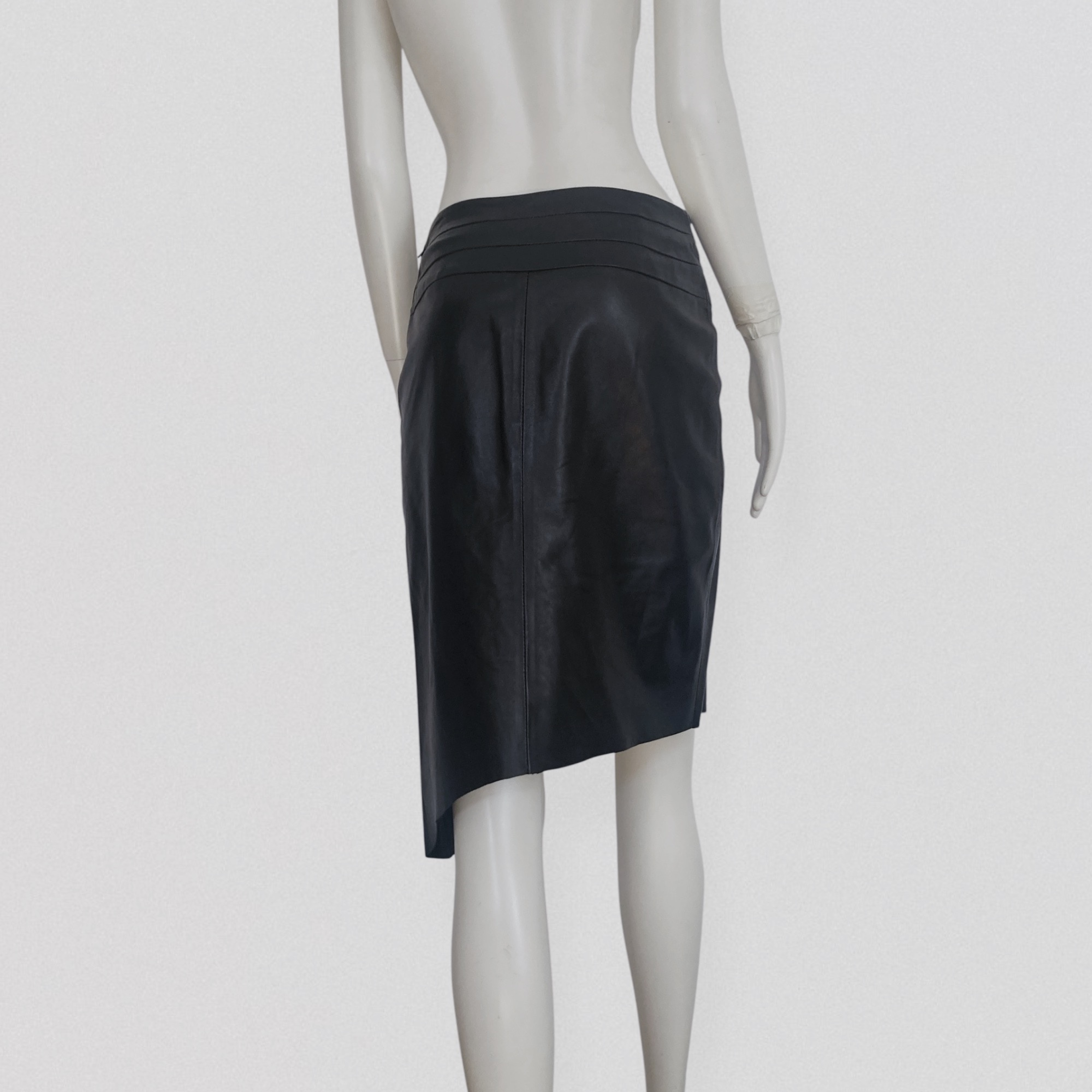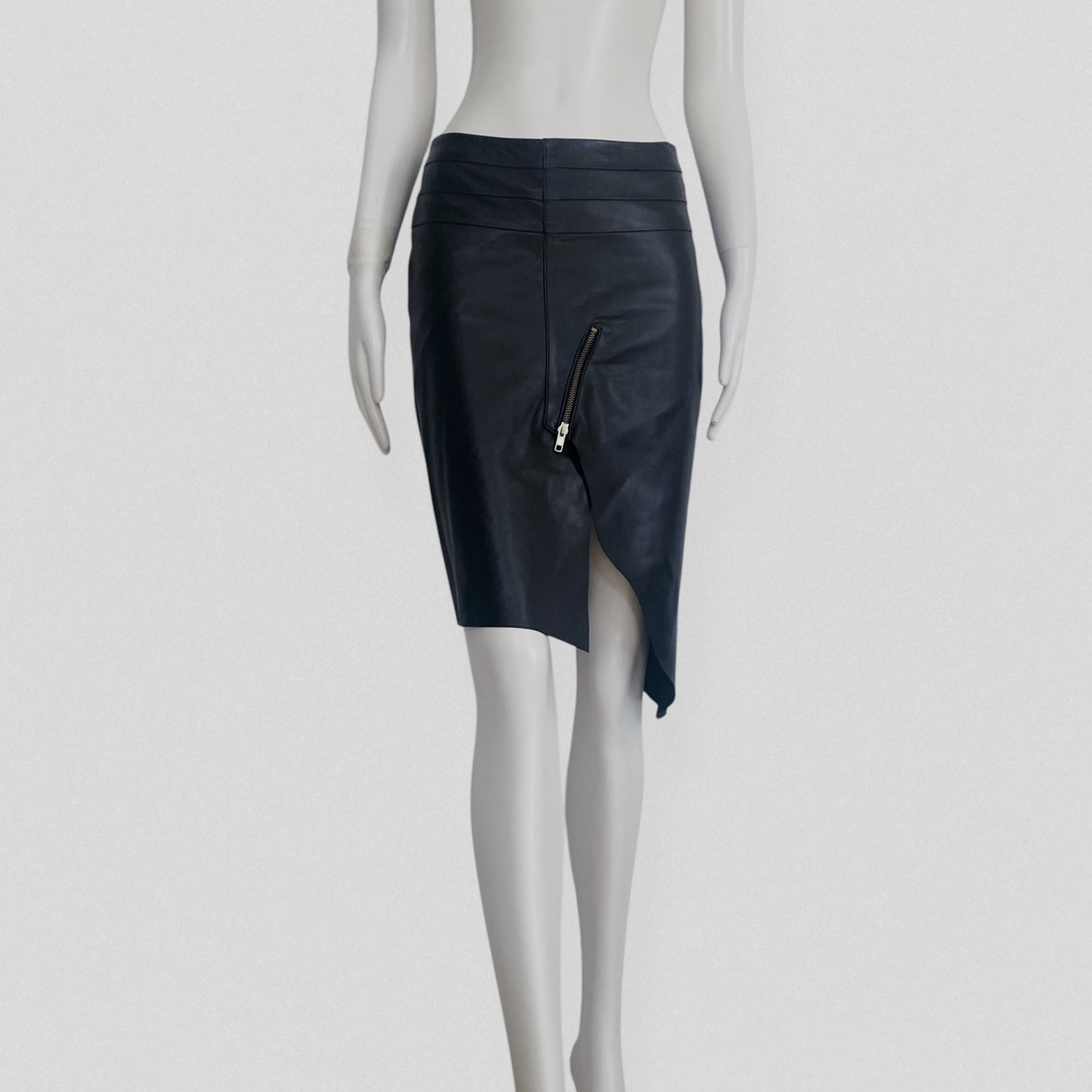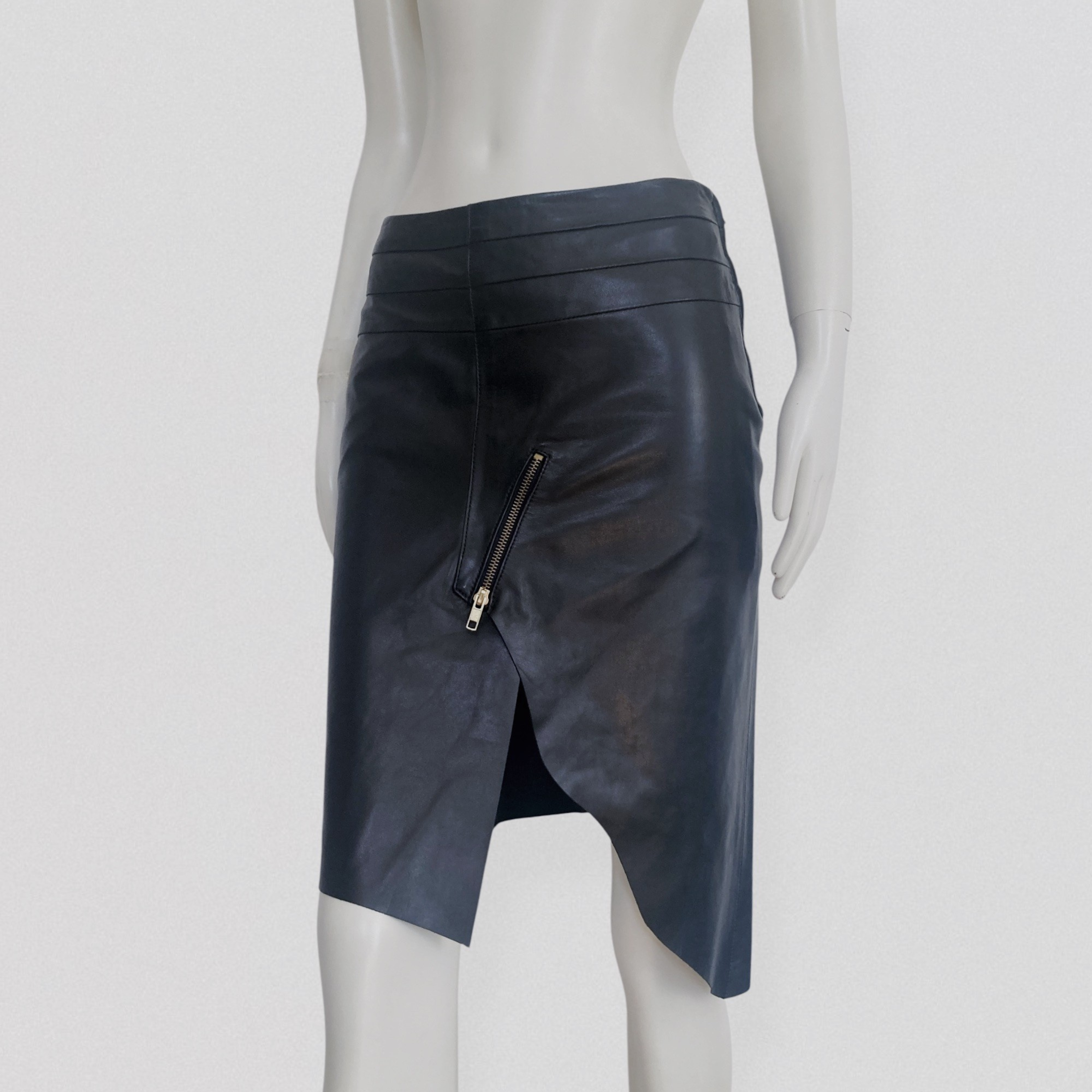 Vintage 90s black asymmetrical leather skirt by Italian brand Mariella Burani. This bias-cut, body-hugging midi skirt is crafted from soft, supple leather that moves beautifully with the body. The leather is accented with decorative stitching at the waist and a diagonal front zipper that extends the slit for added style. It closes with a side zipper and is lined.