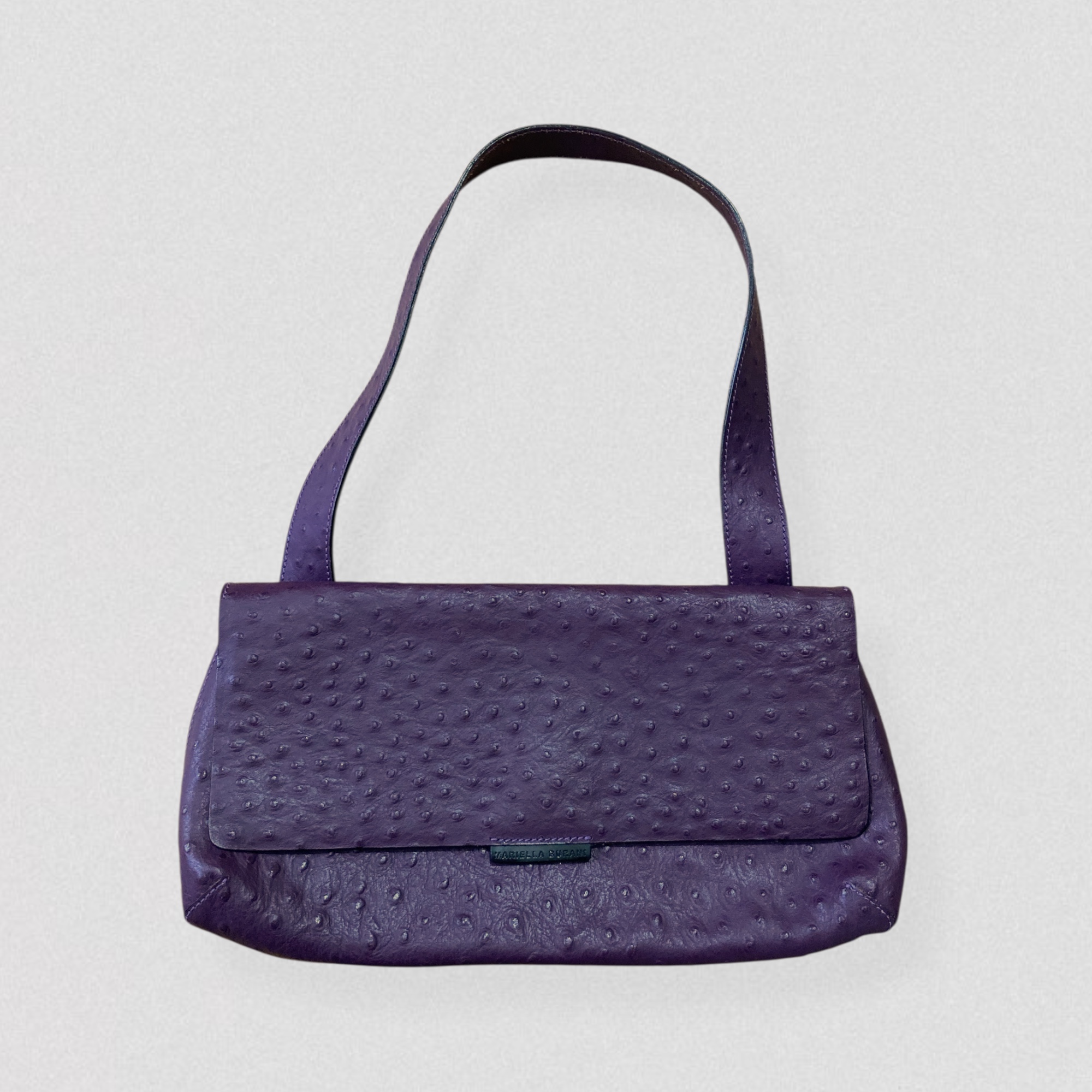 Vintage 90s purple leather bag with reptile embossing by the Italian brand Mariella Burani. This baguette-style bag features a wide magnetic flap & wide leather strap. Made from beautiful dark purple leather with a textured snake pattern, it also includes an interior zip pocket for secure storage.