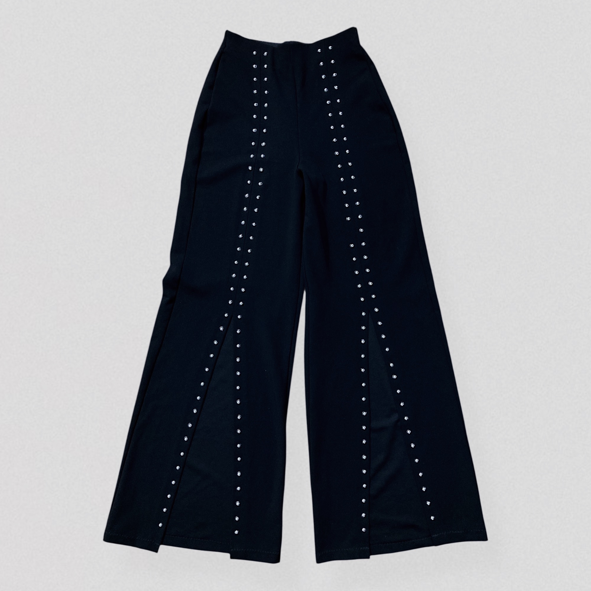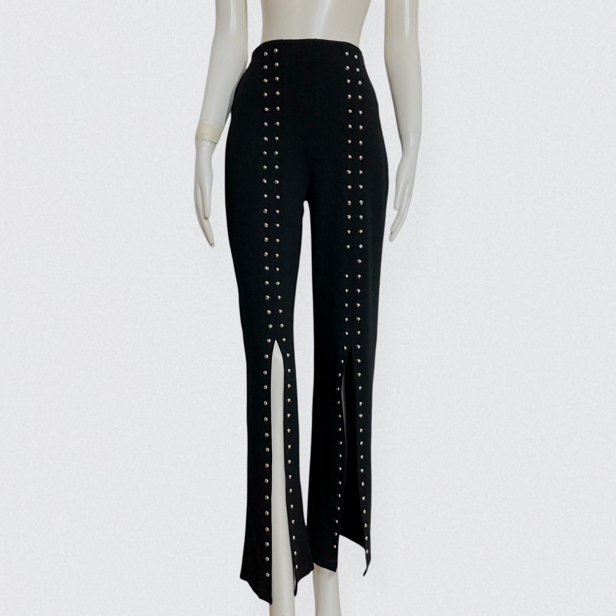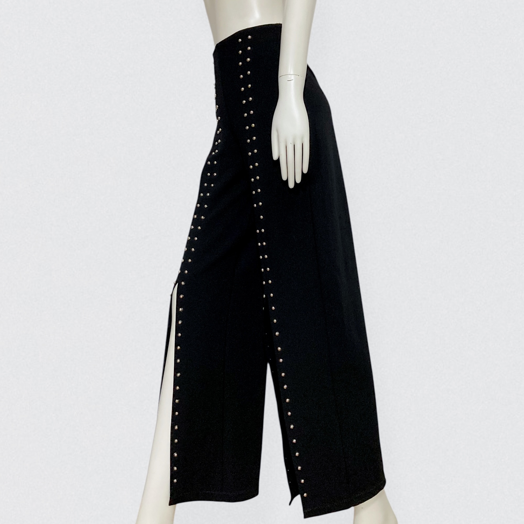 Vintage 00s black studded pants by Italian brand Prada. These striking pants feature a flattering high waist and flared legs with front center slits that beautifully reveal the shoes. The pants is adorned with two rows of round metal silver studs running down each leg. Crafted from a thick, super-stretchy fabric, they sculpt the body while remaining comfortable and easy to slip on thanks to the elastic waistband.