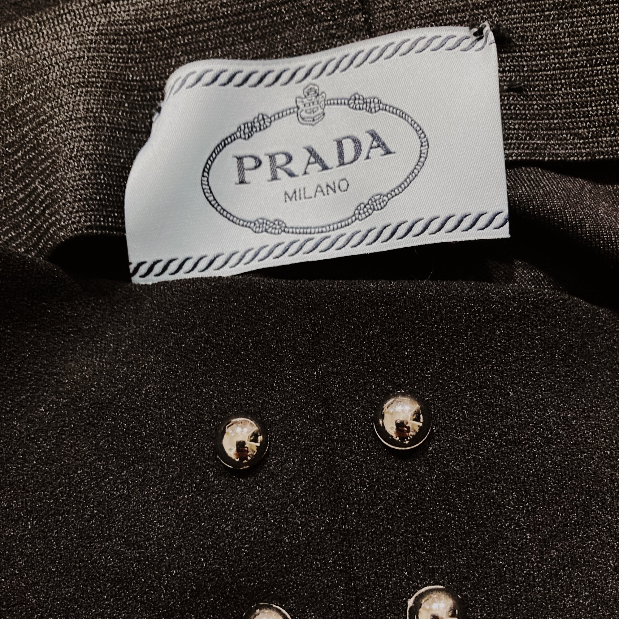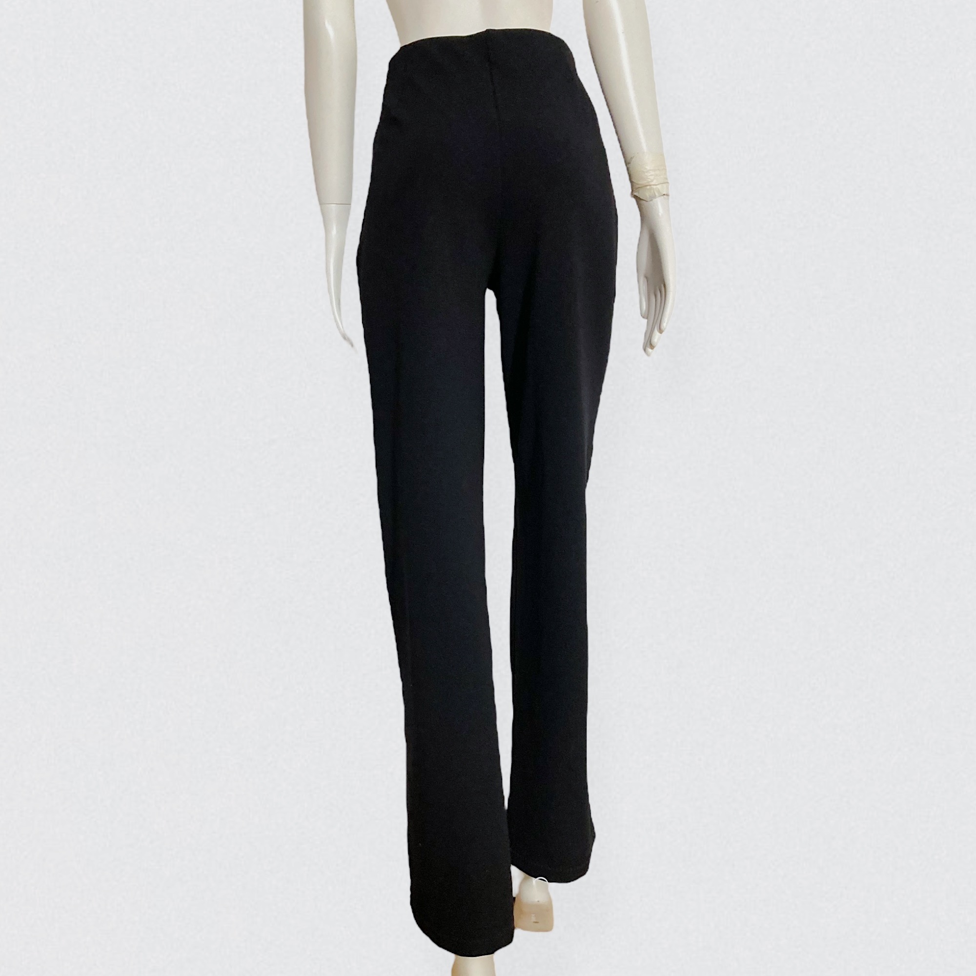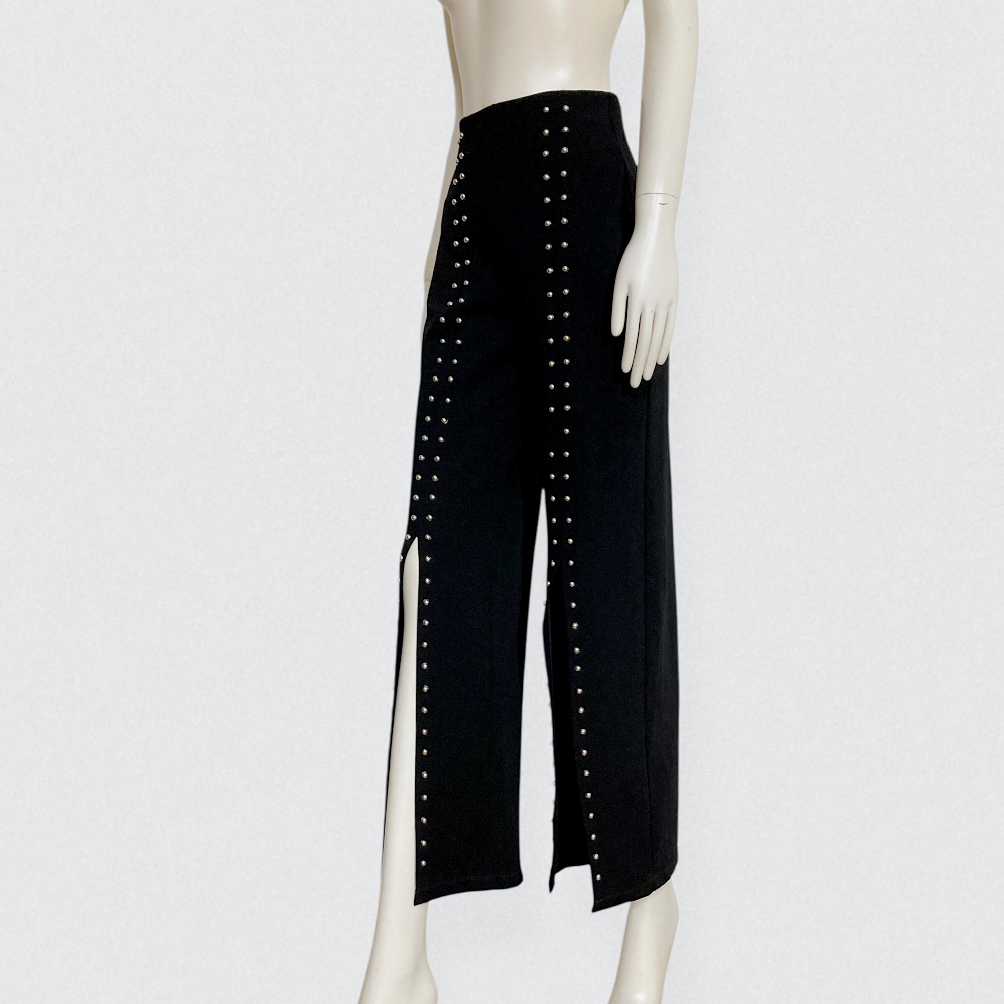 Vintage 00s black studded pants by Italian brand Prada. These striking pants feature a flattering high waist and flared legs with front center slits that beautifully reveal the shoes. The pants is adorned with two rows of round metal silver studs running down each leg. Crafted from a thick, super-stretchy fabric, they sculpt the body while remaining comfortable and easy to slip on thanks to the elastic waistband.