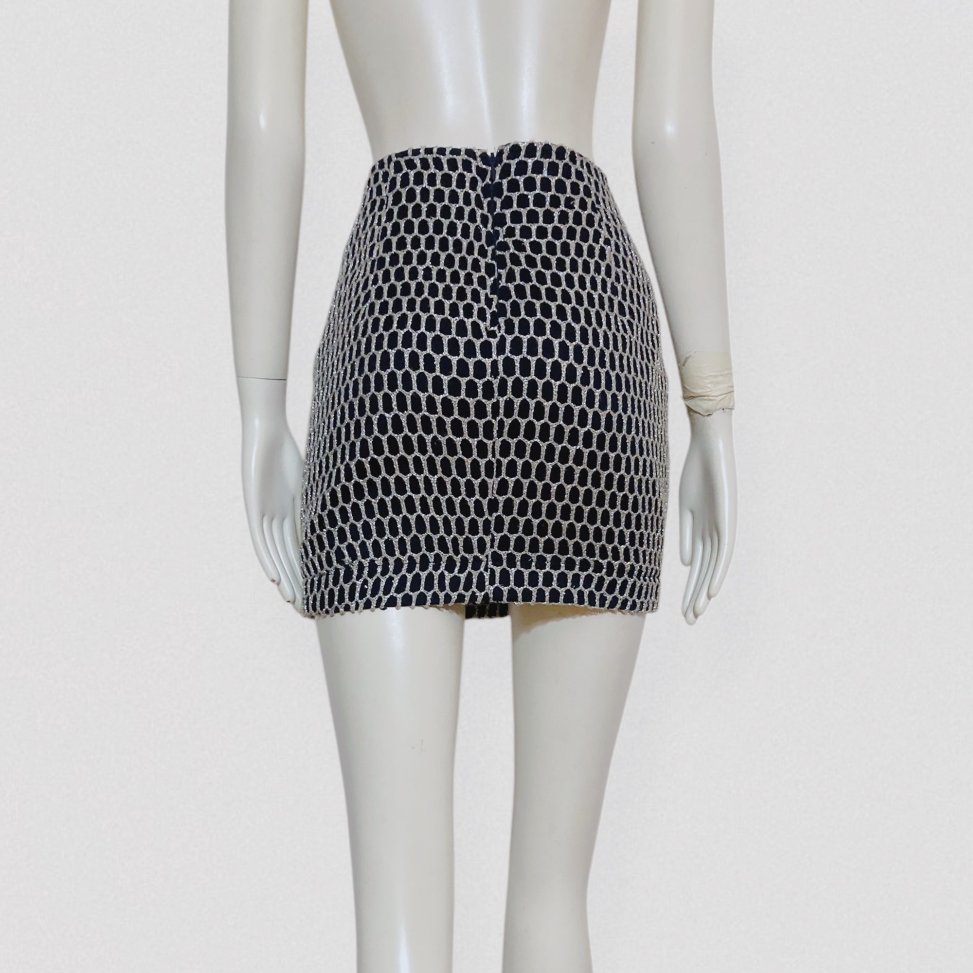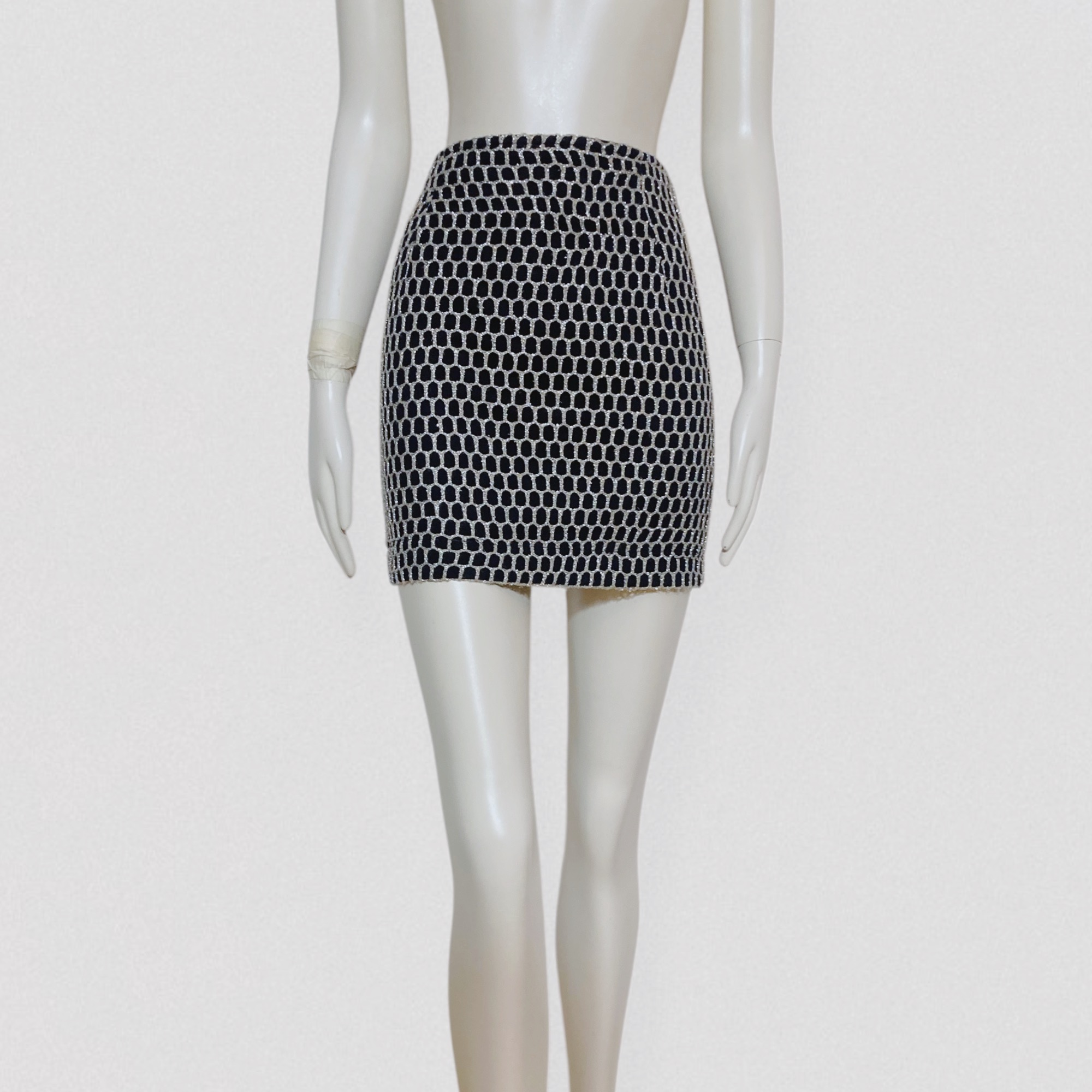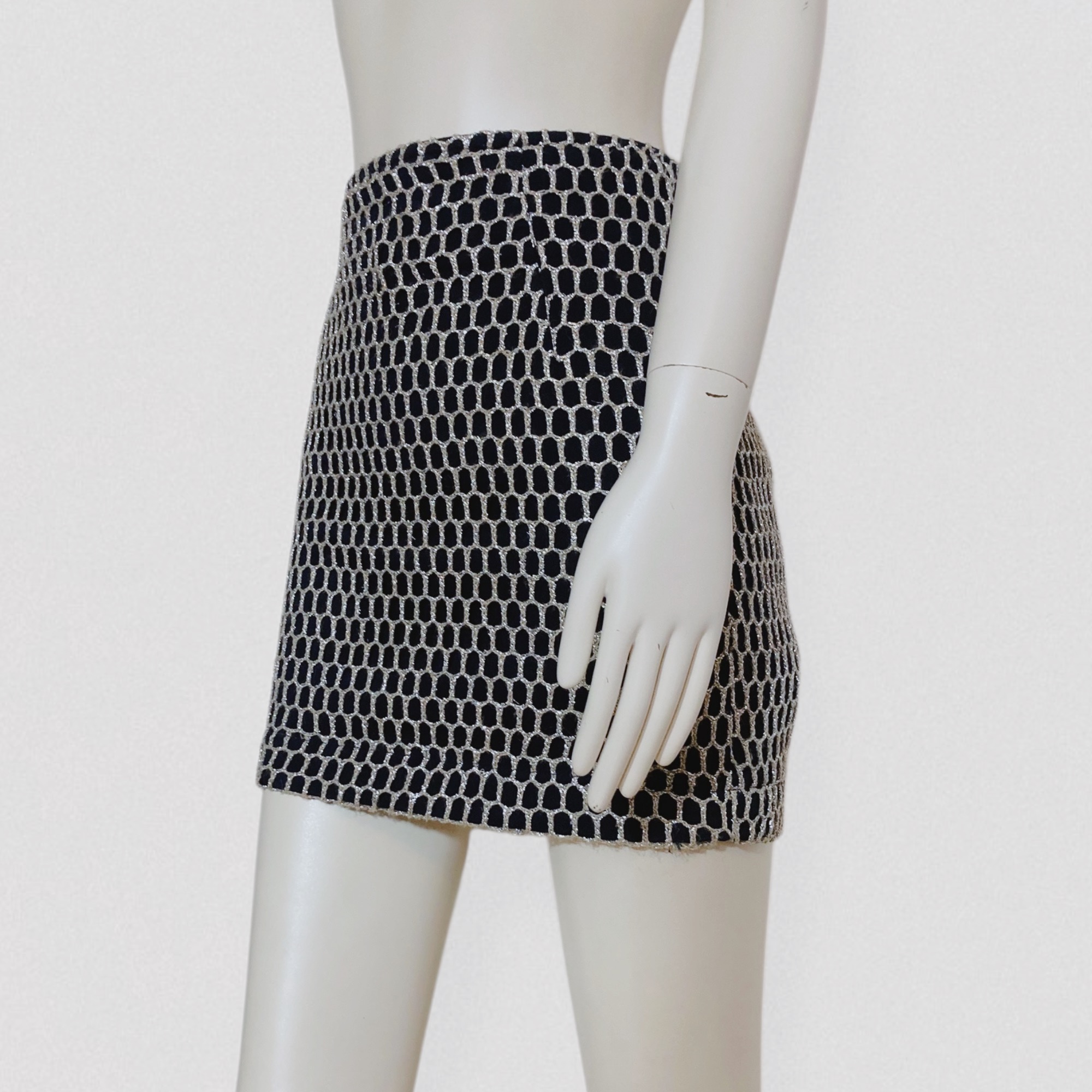 Vintage 80s black tube mini skirt with silver fishnet style embroidery by the Italian brand Roccobarocco, Jeans line. This high-waisted mini skirt features a fitted, bodycon silhouette. It is crafted from thick black cotton and topped with a second layer of oversized silver fishnet mesh, allowing the fabric underneath to show through. The skirt closes with a zipper.