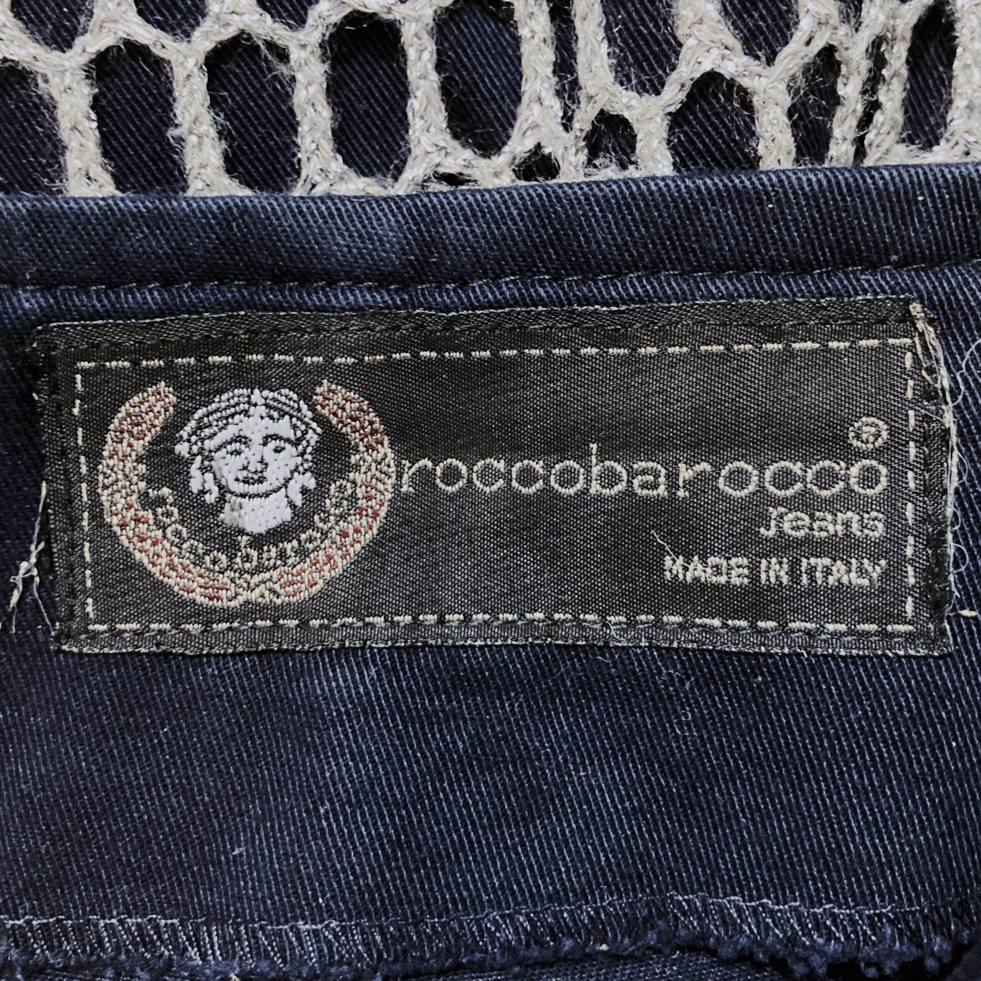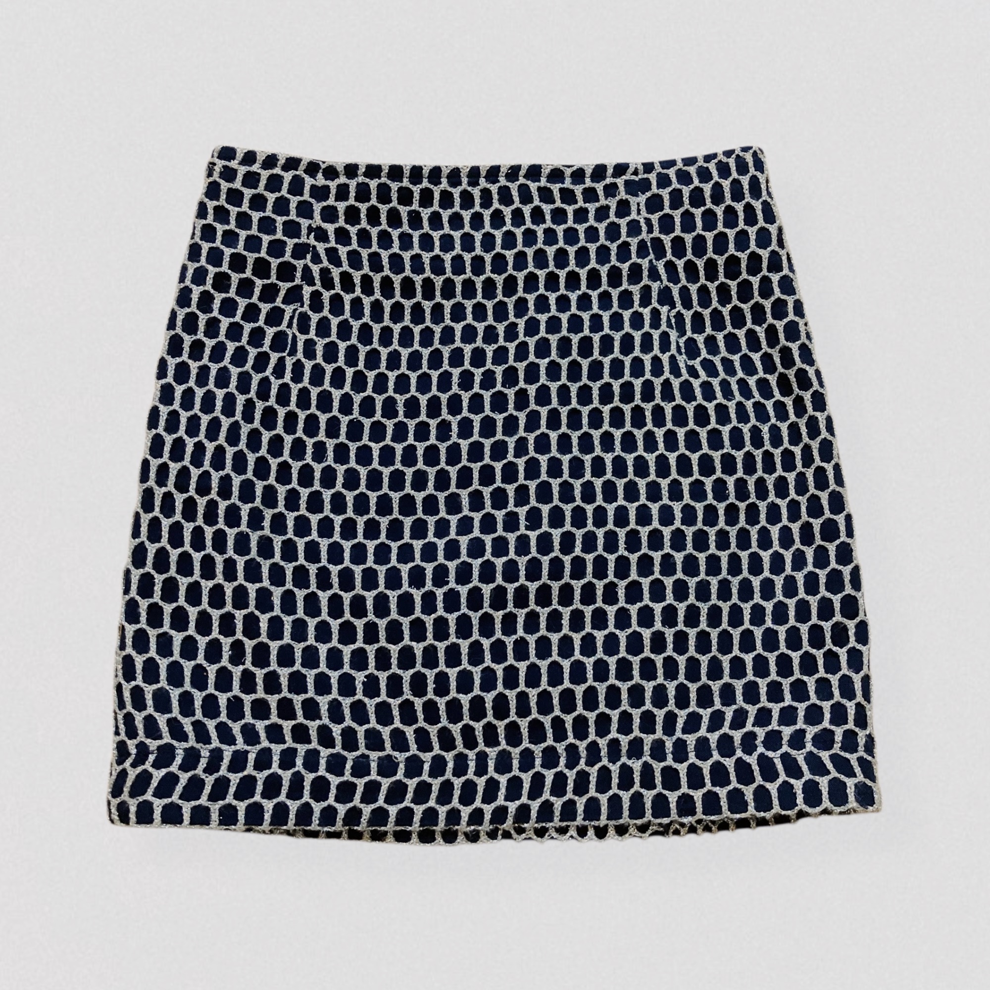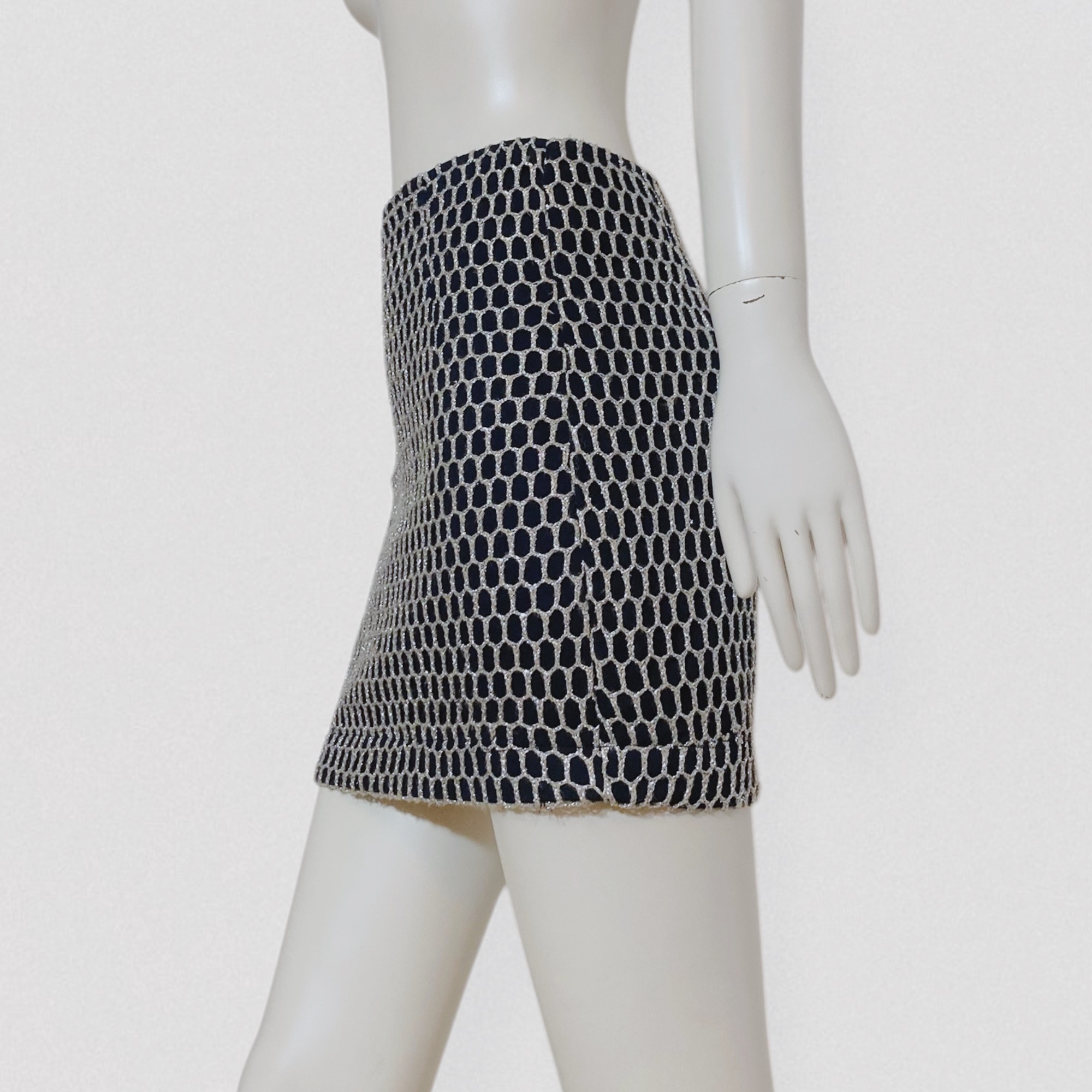 Vintage 80s black tube mini skirt with silver fishnet style embroidery by the Italian brand Roccobarocco, Jeans line. This high-waisted mini skirt features a fitted, bodycon silhouette. It is crafted from thick black cotton and topped with a second layer of oversized silver fishnet mesh, allowing the fabric underneath to show through. The skirt closes with a zipper.