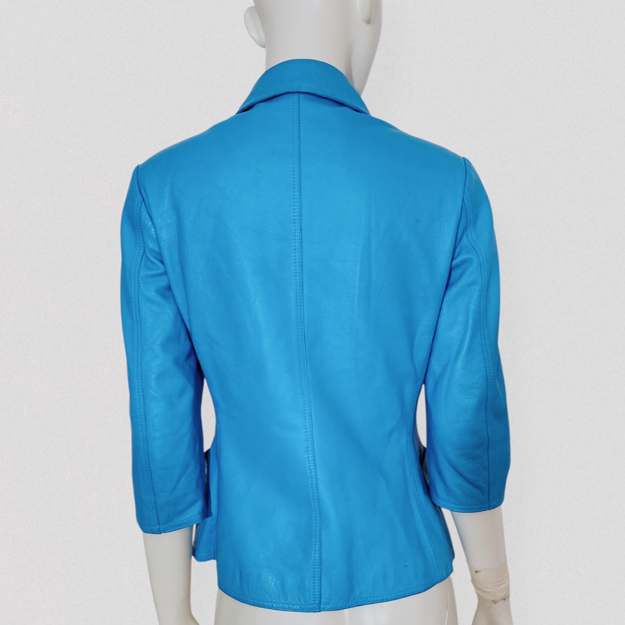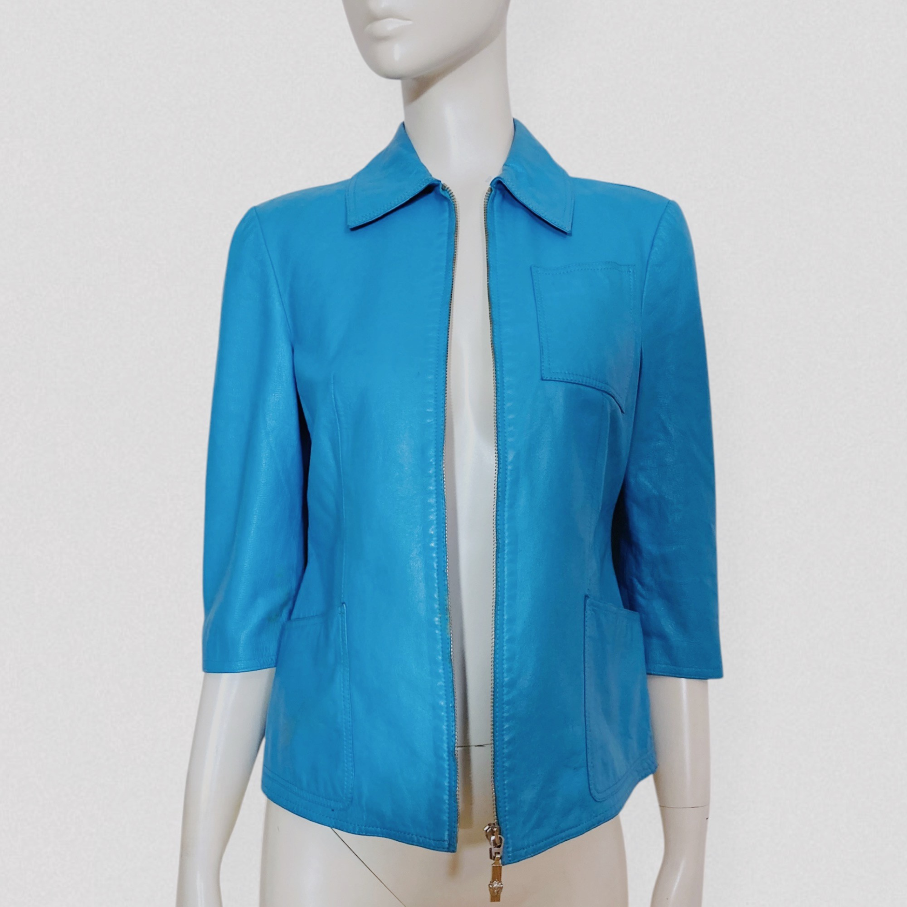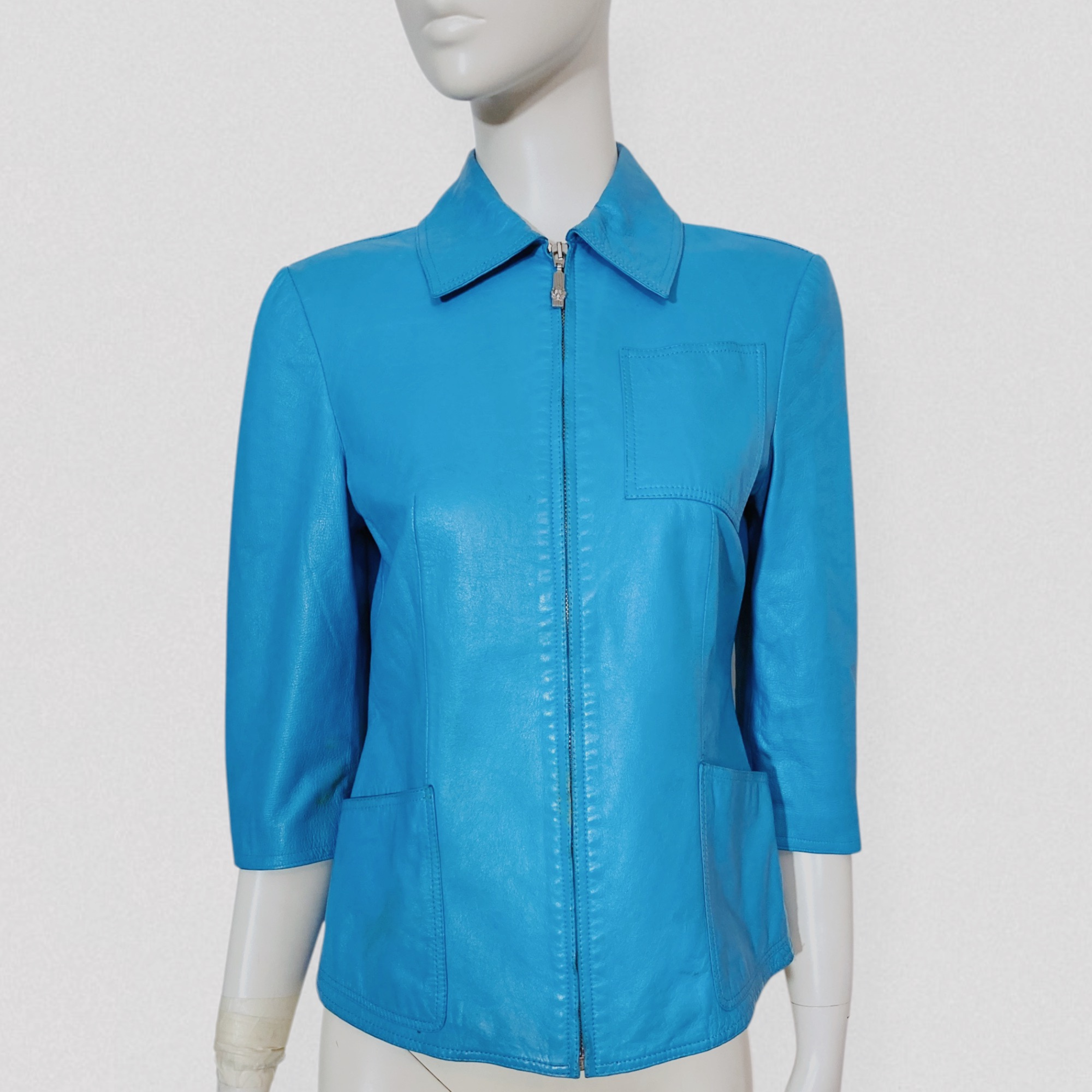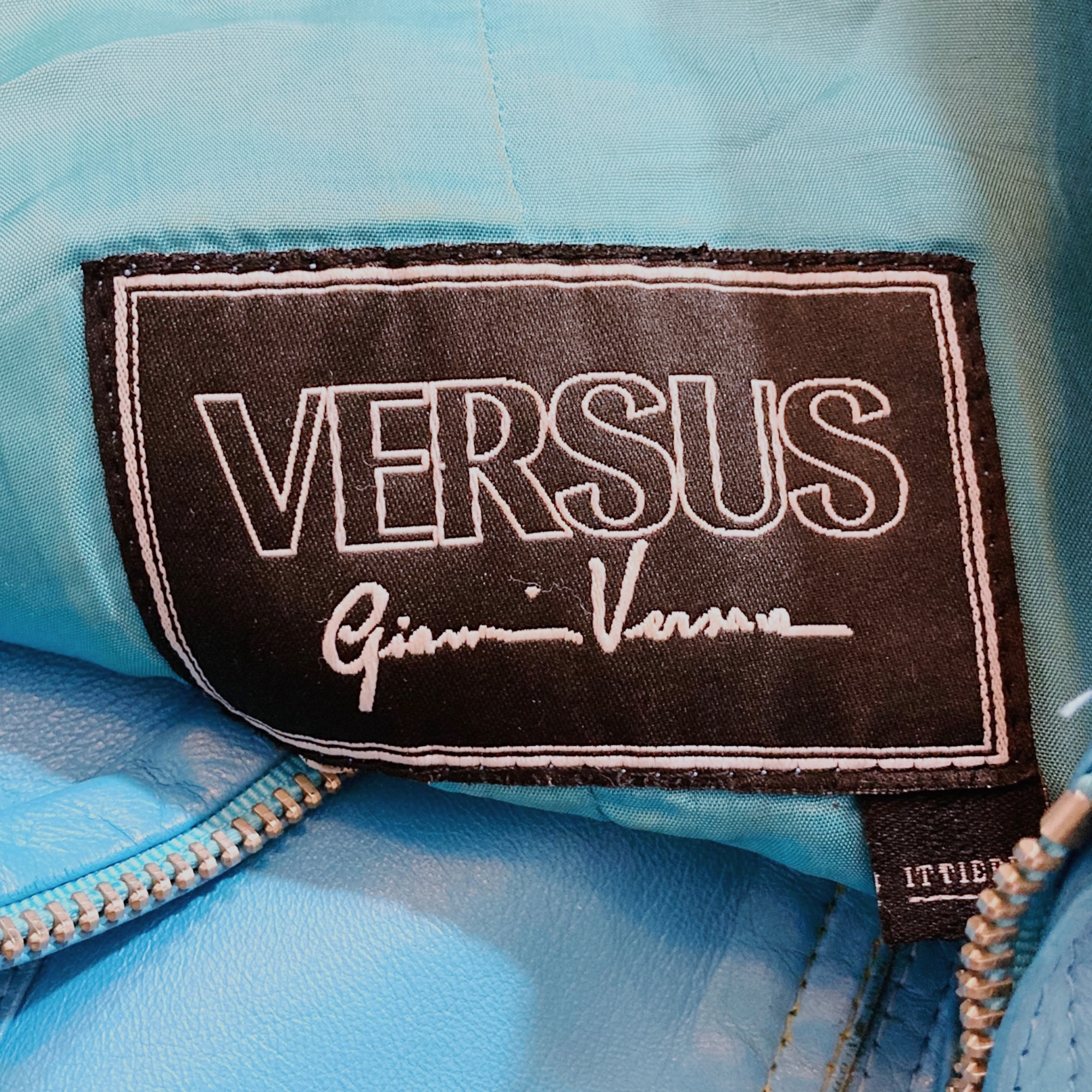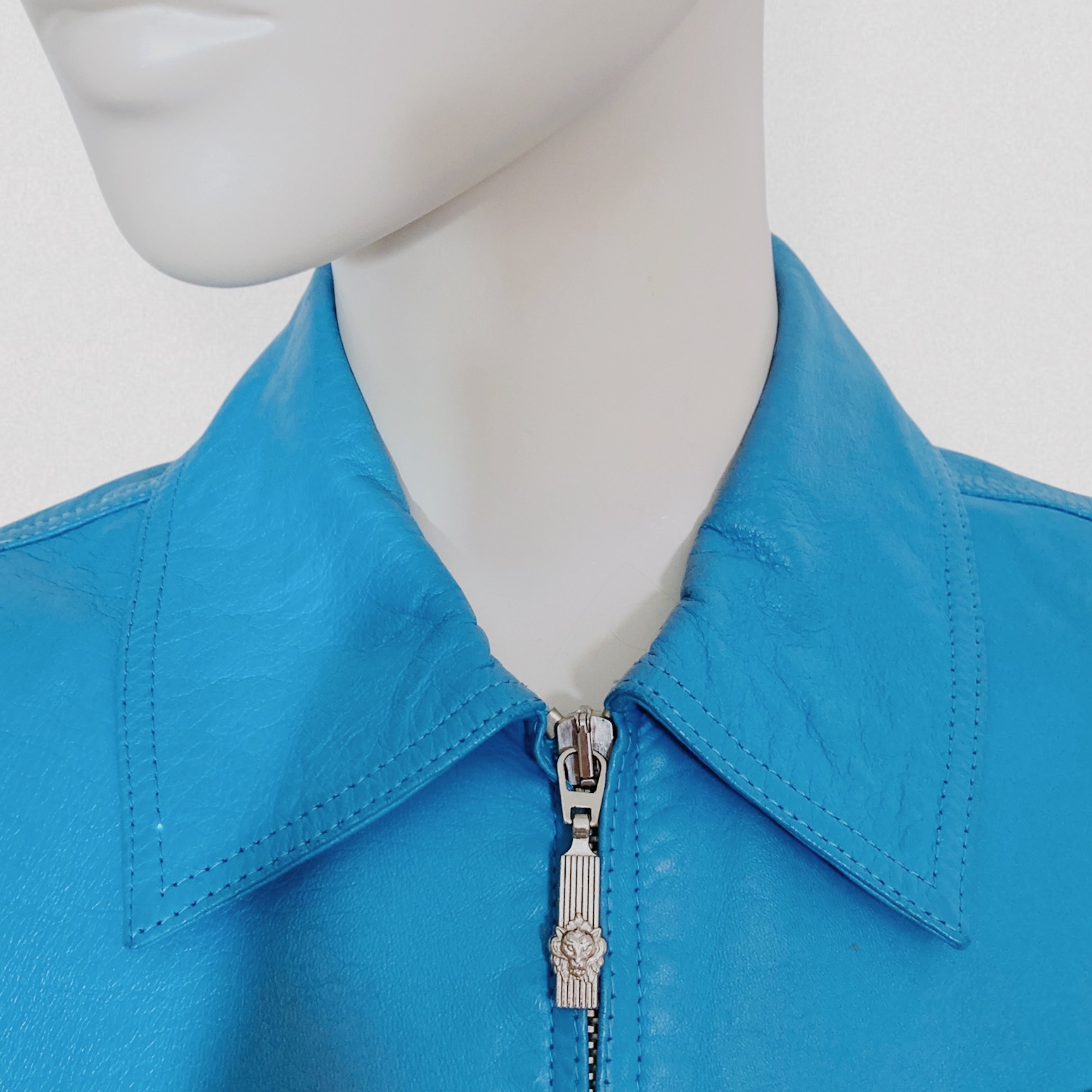 Vintage early 00s light blue leather jacket by the Italian brand Versus by Gianni Versace. This shirt-style jacket has a fitted silhouette, three-quarter sleeves, and 3 front pockets. It closes with a silver metal zipper adorned with a lion head. Crafted from soft, fine light blue leather, the jacket is fully lined and very comfortable to wear.